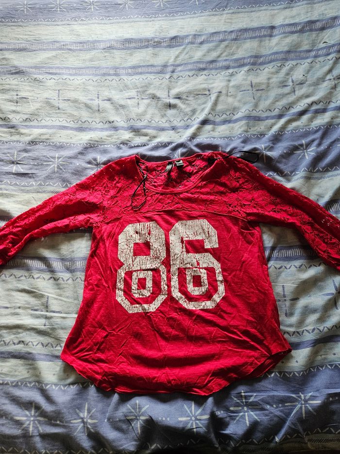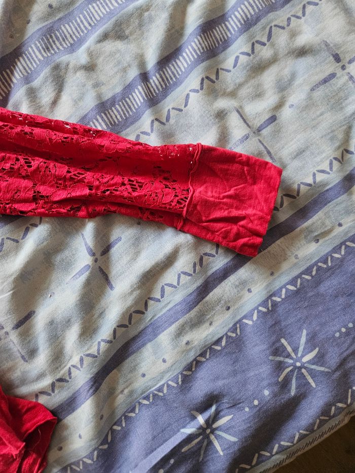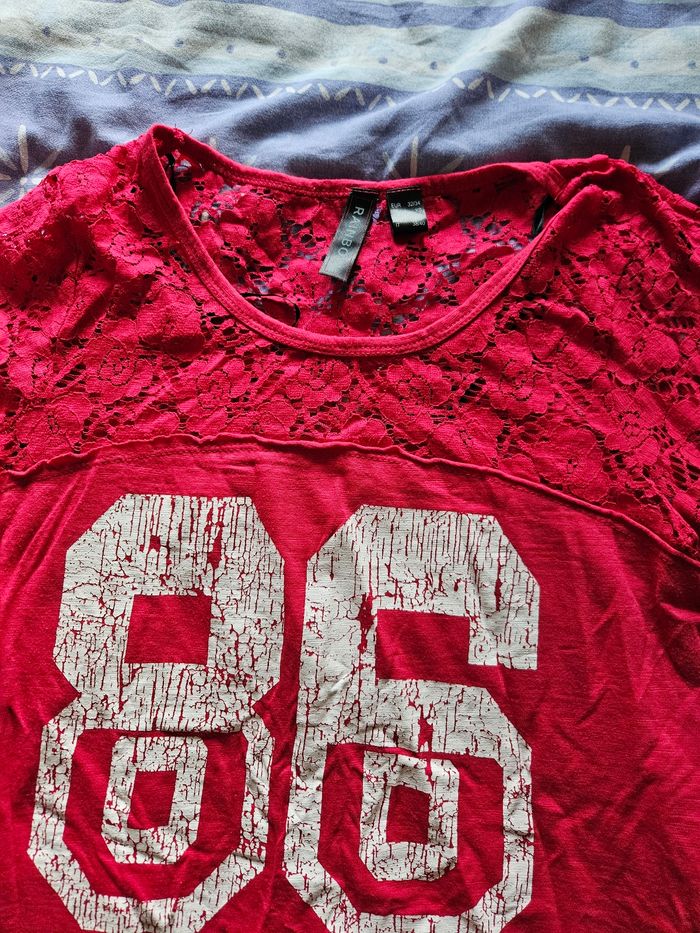 Blouse rose foncé, motif devant. Dentelle cou et manches