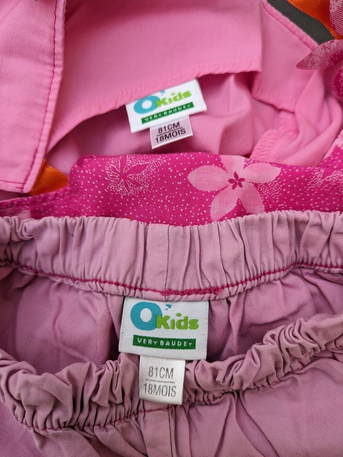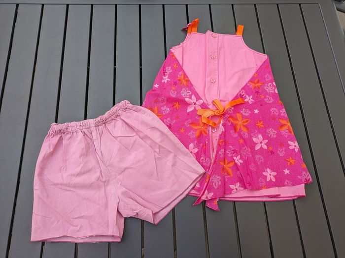 Bonjour, Je vends cet ensemble robe été + short taille élastique Vertbaudet pour fille 18 mois. Motifs fleurs. Attache robe par boutons et noeud dans le dos .