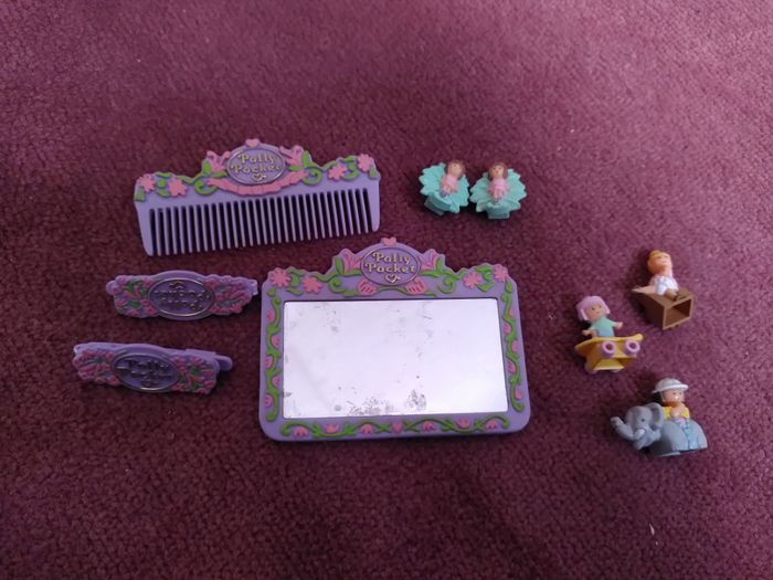 Polly pocket pretty hair vendu avec tout ce qu'il y a sur la photo. Accessoires: 2 barrettes, un miroir, un peigne, une paire de boucles d'oreilles et 3 personnages.