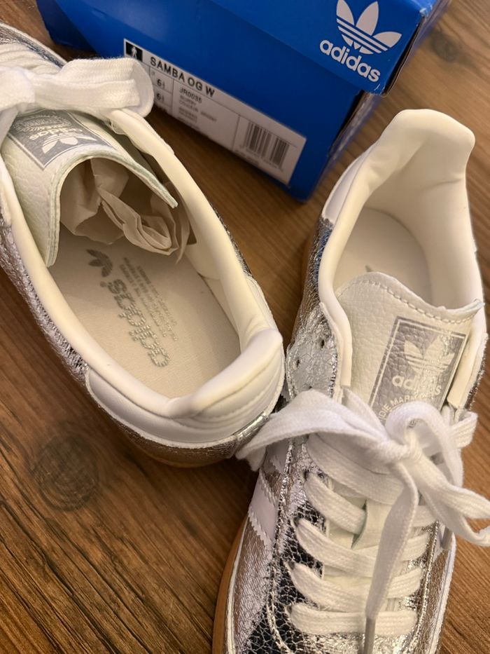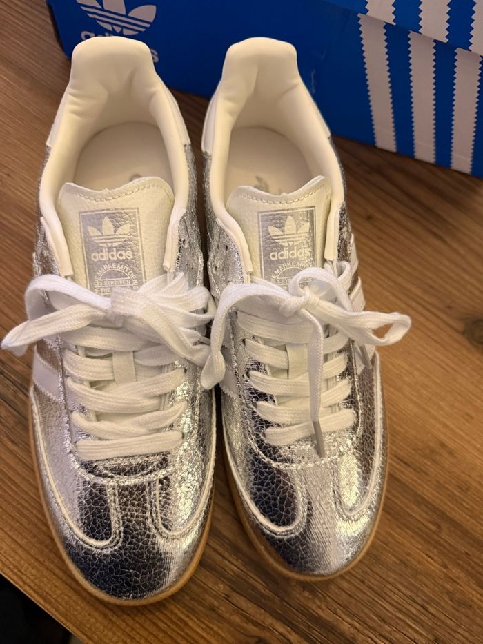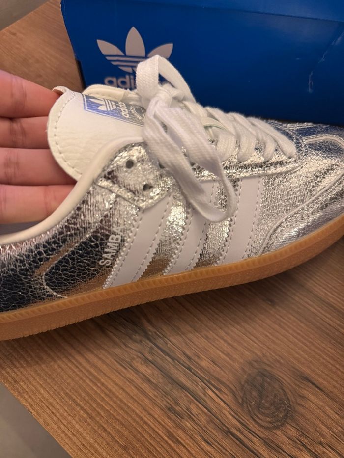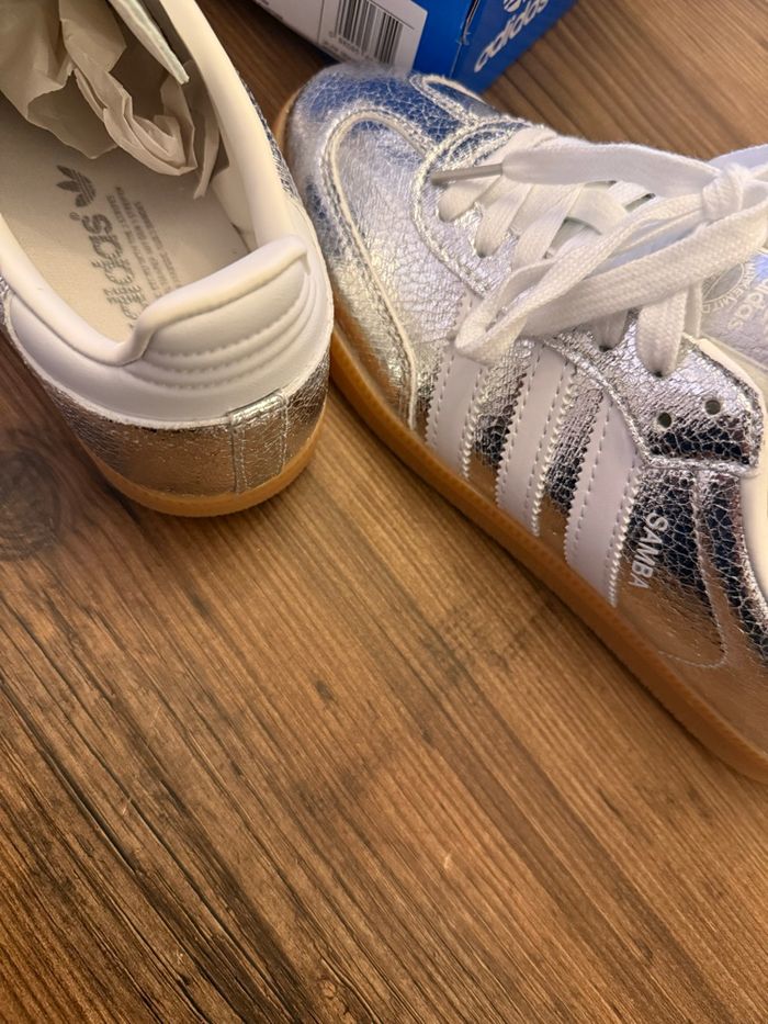 Je vends une paire de Adidas Samba OG couleur argent métallisé avec bandes blanches et semelle gomme. • Taille : 40 • Modèle : Samba OG W • Couleur : Argent métallisé / Blanc • État : Comme neuves (jamais portées ou juste essayées) • Vendues avec boîte d’origine Très tendance, parfaites pour un look chic et street 🤍 Aucun défaut à signaler.