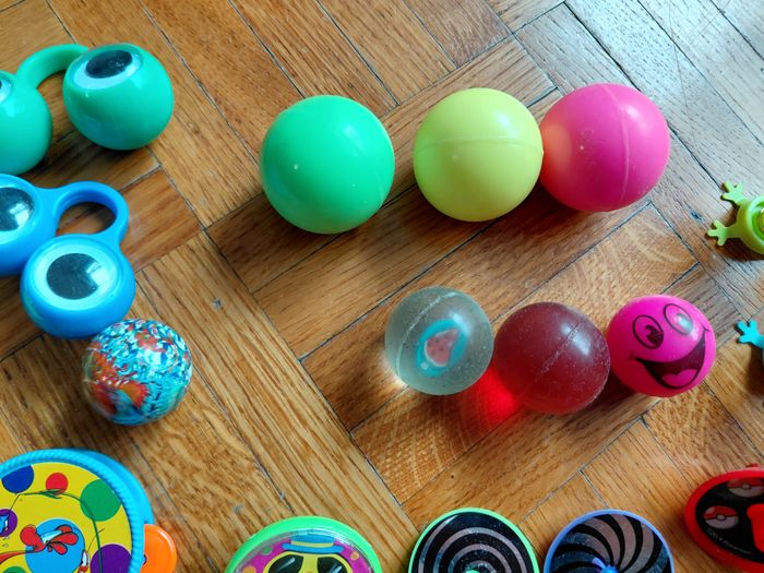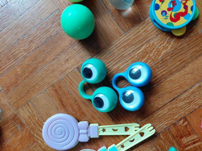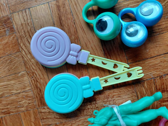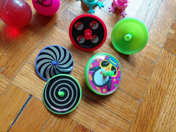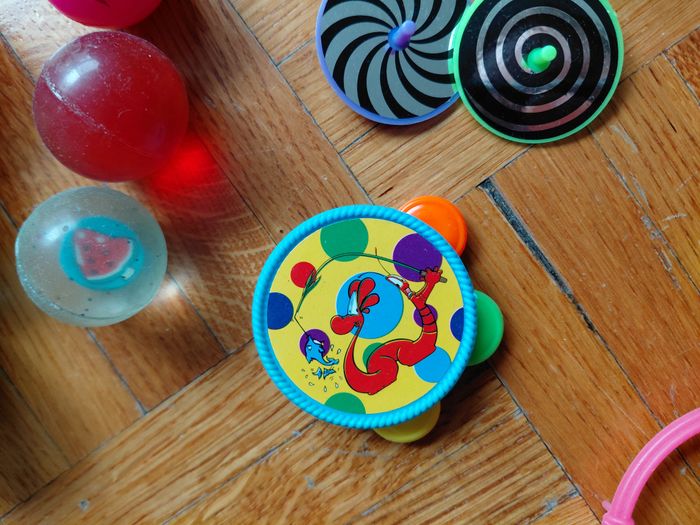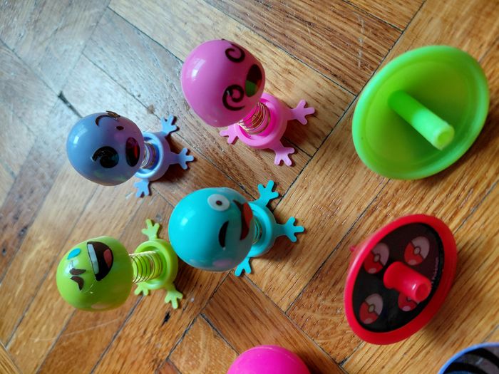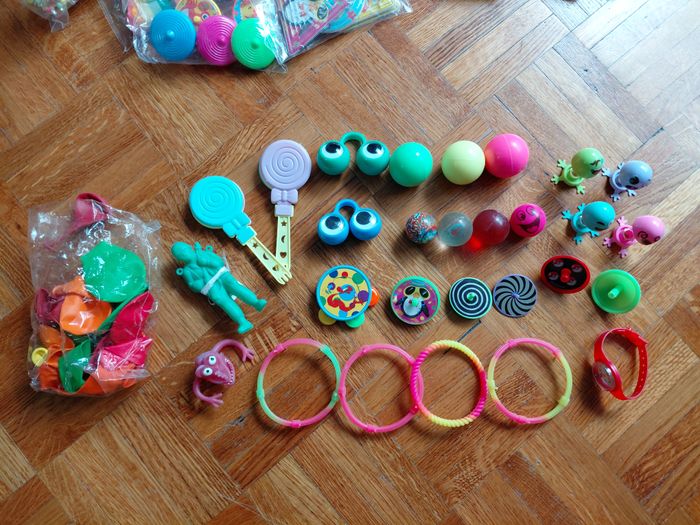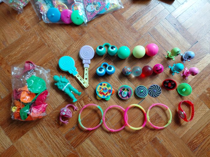 lot pour remplir piniata d'anniversaire enfant 3 grosses balles rebondissantes 4 petites 5 mini toupies dont 1 pokemon 1 mini tambourin 2 paires d'yeux à mettre aux doigts 2 "sucettes" sort de maracas 1 parachutiste (bonhomme vert) 1 monstre à mettre au bout du doigt 4 bracelets fluo montre jeux à billes 4 bonhommes à ressort ballons à gonfler la plus part sont neufs, jouets restant des divers anniversaires de mes enfants, certaines balles et bonhommes à ressort pas neufs