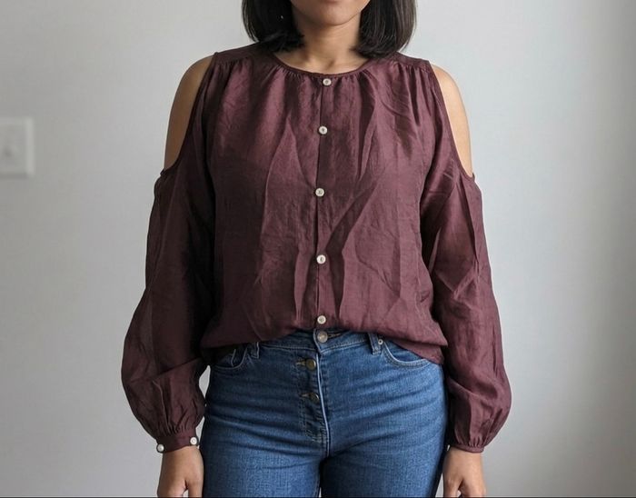 Blouse bordeaux fluide manche longue et épaule dénudée sur le côté chic et élégant - photo numéro 1