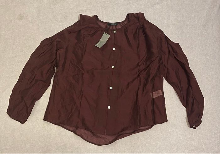 Je vends cette jolie blouse de la marque PARFOIS, neuve avec étiquette. Couleur bordeaux / lie-de-vin, très chic et intemporelle. Matière légère et idéale pour une tenue élégante de jour comme de soirée. Coupe fluide avec manches longues, col arrondi et boutons nacrés sur le devant pour une touche raffinée. Épaule dénudée sur le coté. Le dos est légèrement plus long que le devant pour un joli tombé. Note : légèrement transparent. À porter avec un débardeur en dessous, ou sans débardeur selon les goûts. État : neuf avec étiquette Marque : Parfois Type : blouse / haut fluide Couleur : bordeaux Taille : taille unique (convient S et M ) Détails : manches longues, épaules dénudée sur le coté, boutons nacrés, tissu fluide