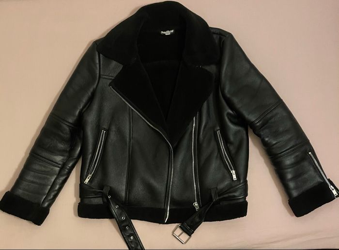 Veste noire style perfecto / aviateur/ biker, très tendance, avec doublure intérieure type mouton synthétique (col, poignets et bas), idéale pour l’automne et l’hiver. Fermeture zippée asymétrique, plusieurs poches zippées, ceinture ajustable à la taille et zips aux poignets pour un look rock et moderne. État : bon état général. Présence de traces d’usure visibles sur les manches (voir photos), qui n’altèrent ni le style ni le port de la veste. Taille : 40 Marque : Topshop Couleur : noir Style : biker / aviateur Matière : similicuir Parfaite pour compléter une tenue casual ou rock.