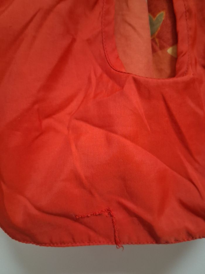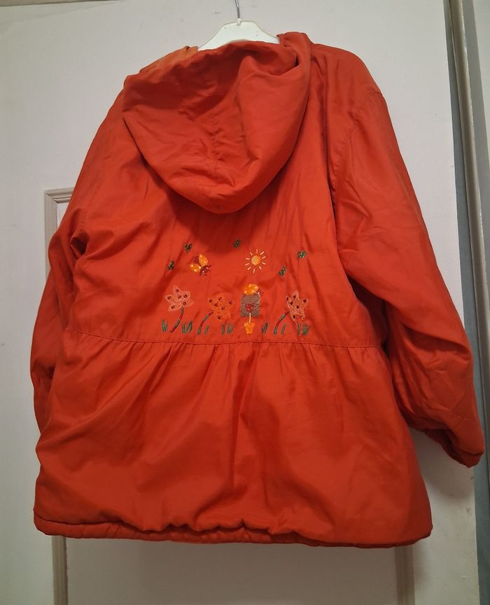 Manteau à capuche, fermé par fermeture éclair Un cote orange a fleurs Un côté rouge, avec broderies au dos.petit accroc sur la poche