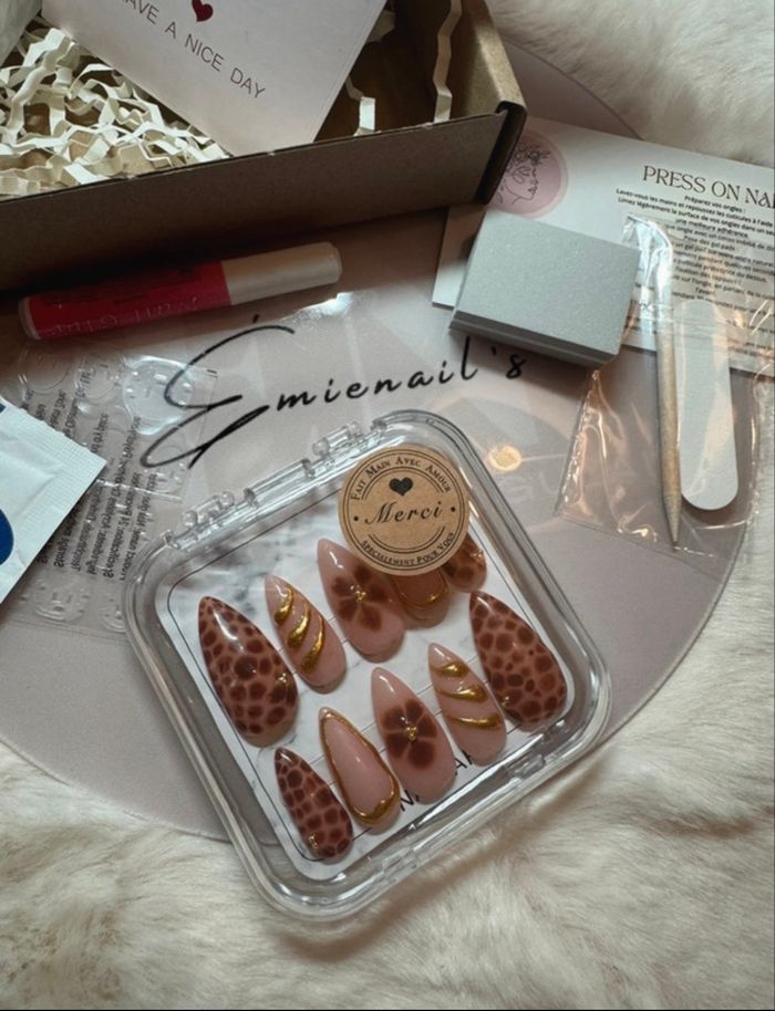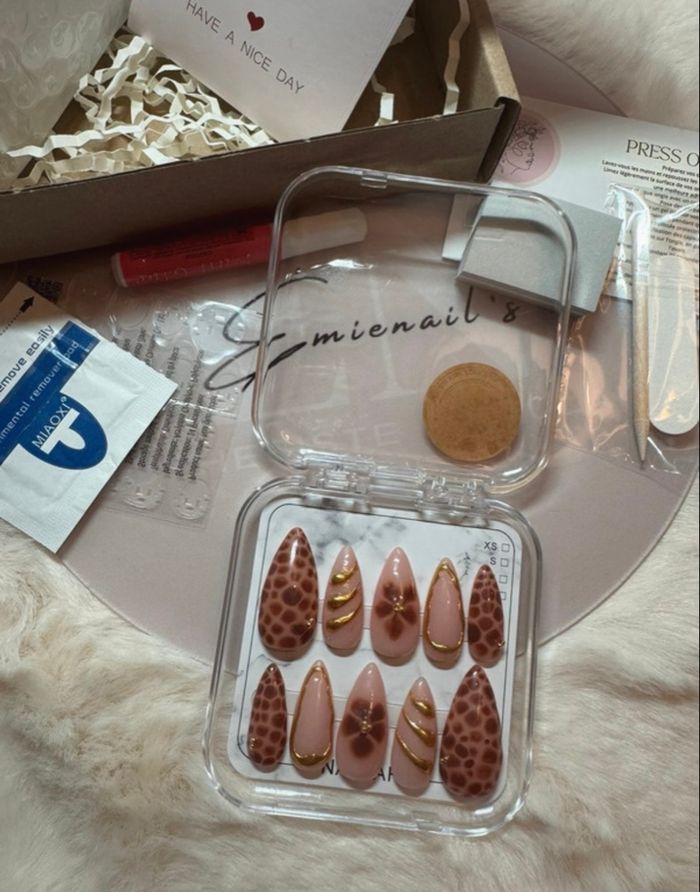 🌸 Bonjour 🌸 Siret : 10064774200012 Disponible en tailles XS, S, M, L. Merci de m’indiquer votre taille 💖 Bien lire toute la description : ✨ Fournis avec : • une lime • un pousse-cuticules • une lingette nettoyante • une fiche explicative • une colle en stick • une feuille de gels pads (colle) • une carte de fidélité avec des stickers à coller à chaque boîte achetée 💝 Une fois la carte pleine, une boîte offerte au choix ! Si vous avez déjà la carte de fidélité, n’hésitez pas à me le dire : j’enverrai uniquement le sticker à coller sur la vôtre ❤️ 📦 Une fois votre carte pleine, faites-le-moi savoir et choisissez : je m’occupe de l’envoi de la boîte offerte 😍 💡 Aide : ❓ Quelle taille dois-je prendre ? Pour trouver votre taille de Press On Nails, vous devez mesurer la largeur de vos ongles. Un test de mesure très simple (que je vous envoie au moment de votre demande) est réalisable chez vous, à l’aide de seulement trois éléments : 🩹 scotch 🖊️ feutre 📏 règle 💅 Nous avons toutes des ongles différents : plats, larges, bombés, courts, rongés… ➡️ La longueur de vos ongles importe peu. 🌷 Mes conseils : La taille standard est la taille S : elle s’adapte à la plupart des personnes. La taille XS convient aux ongles très fins en largeur. Les tailles M et L sont conseillées pour des largeurs d’ongles plus importantes. ✨ Si vous avez les ongles plats, je vous conseille de choisir une taille au-dessus. ✨ Si vous hésitez entre deux tailles, je vous conseille de prendre la taille en dessous pour un résultat qui durera plus longtemps. 📸 Si vous hésitez toujours, vous pouvez m’envoyer une photo de vos mains, ongles bien visibles, avec une pièce de 20 centimes à côté. Je pourrai ainsi regarder la taille réelle 💕 💖 À bientôt, prenez soin de vous, Émienail’s 💅✨ #PressOnNails #NailArtAddict #NailDesigns #NailInspo #NailAddict #NailArtist