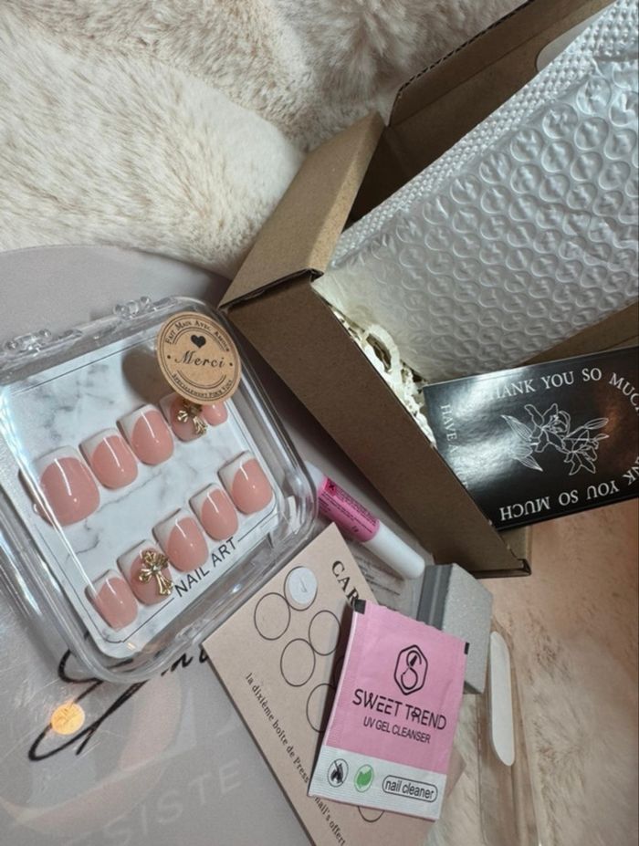 🌸 Bonjour 🌸 Siret : 10064774200012 Disponible en tailles XS, S, M, L. Merci de m’indiquer votre taille 💖 Bien lire toute la description : ✨ Fournis avec : • une lime • un pousse-cuticules • une lingette nettoyante • une fiche explicative • une colle en stick • une feuille de gels pads (colle) • une carte de fidélité avec des stickers à coller à chaque boîte achetée 💝 Une fois la carte pleine, une boîte offerte au choix ! Si vous avez déjà la carte de fidélité, n’hésitez pas à me le dire : j’enverrai uniquement le sticker à coller sur la vôtre ❤️ 📦 Une fois votre carte pleine, faites-le-moi savoir et choisissez : je m’occupe de l’envoi de la boîte offerte 😍 💡 Aide : ❓ Quelle taille dois-je prendre ? Pour trouver votre taille de Press On Nails, vous devez mesurer la largeur de vos ongles. Un test de mesure très simple (que je vous envoie au moment de votre demande) est réalisable chez vous, à l’aide de seulement trois éléments : 🩹 scotch 🖊️ feutre 📏 règle 💅 Nous avons toutes des ongles différents : plats, larges, bombés, courts, rongés… ➡️ La longueur de vos ongles importe peu. 🌷 Mes conseils : La taille standard est la taille S : elle s’adapte à la plupart des personnes. La taille XS convient aux ongles très fins en largeur. Les tailles M et L sont conseillées pour des largeurs d’ongles plus importantes. ✨ Si vous avez les ongles plats, je vous conseille de choisir une taille au-dessus. ✨ Si vous hésitez entre deux tailles, je vous conseille de prendre la taille en dessous pour un résultat qui durera plus longtemps. 📸 Si vous hésitez toujours, vous pouvez m’envoyer une photo de vos mains, ongles bien visibles, avec une pièce de 20 centimes à côté. Je pourrai ainsi regarder la taille réelle 💕 💖 À bientôt, prenez soin de vous, Émienail’s 💅✨ #PressOnNails #NailArtAddict #NailDesigns #NailInspo #NailAddict #NailArtist