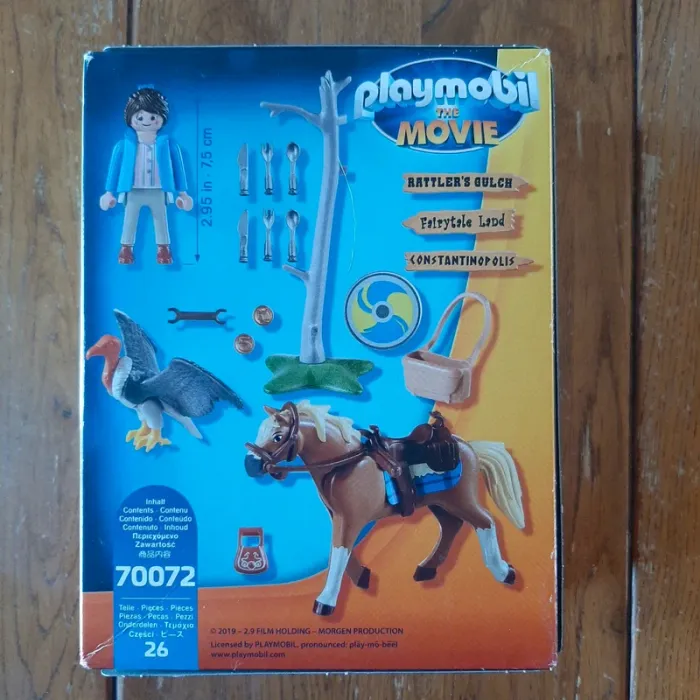 Playmobil The Movie Marla avec Cheval La boîte contient 26 pièces: Marla, son cheval, un Vautour et des accessoires. Age: > 5 ans Produit neuf, boîte jamais ouverte, emballage encore scellé.