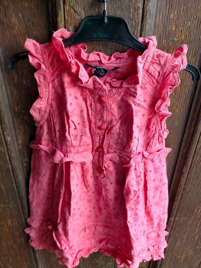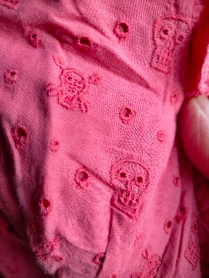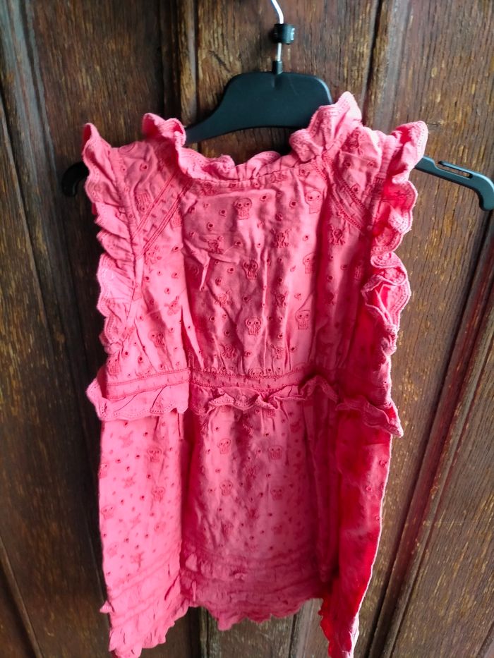 TBE très belle robe sans manche façon broderie anglaise avec " têtes de mort " corail. Volant au col, aux emmanchures, à la taille et à la base. Une robe faussement sage, adorable.