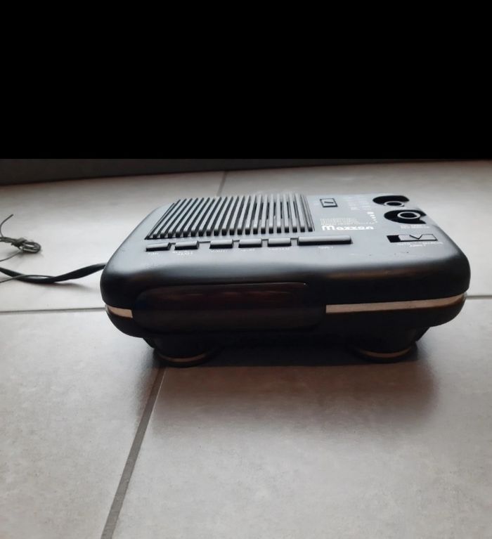 Radio réveil bon état il manque juste 2 caches au niveau des boutons du haut mais cela n'empêche en rien sa fonction Taille 17x13cm