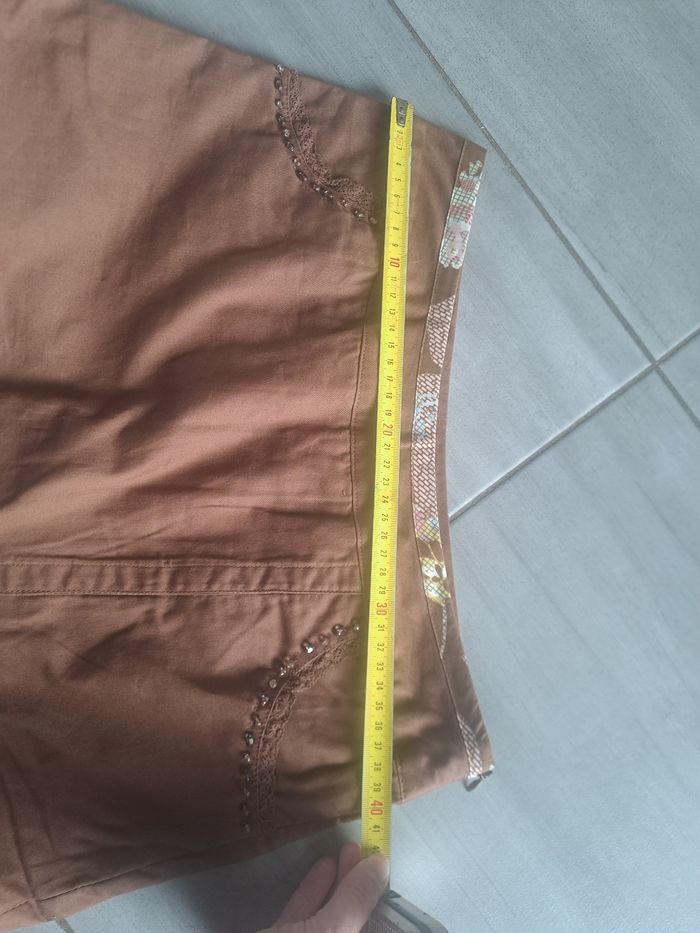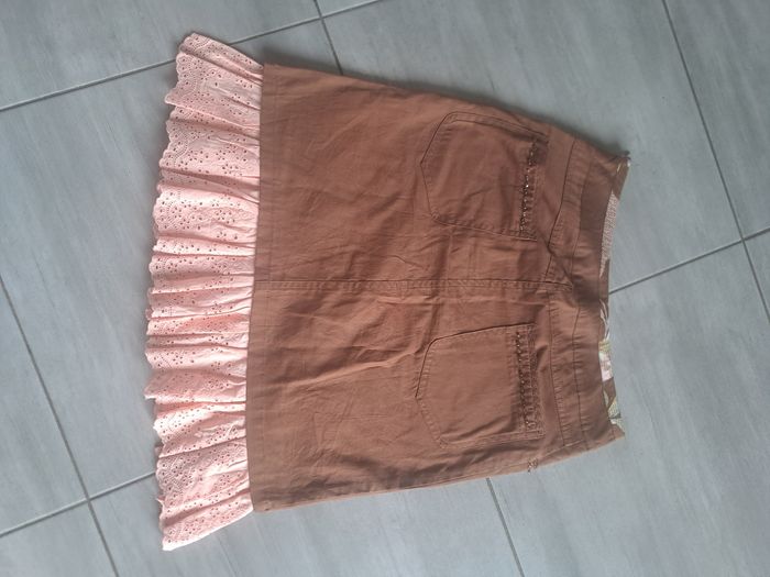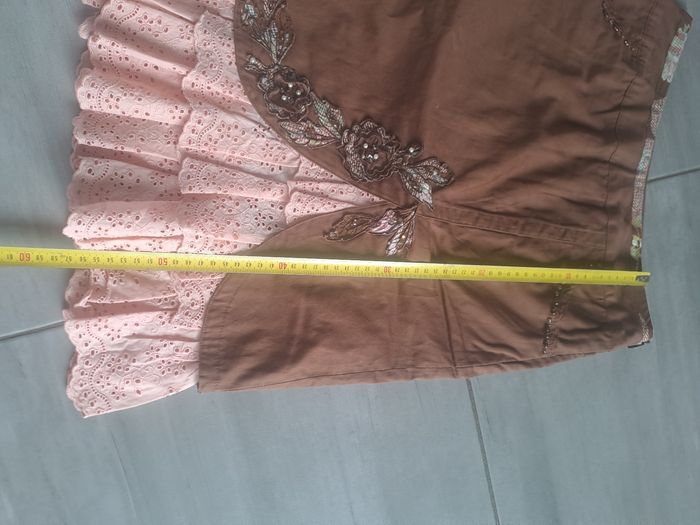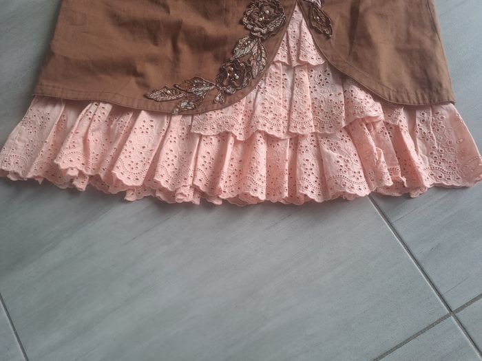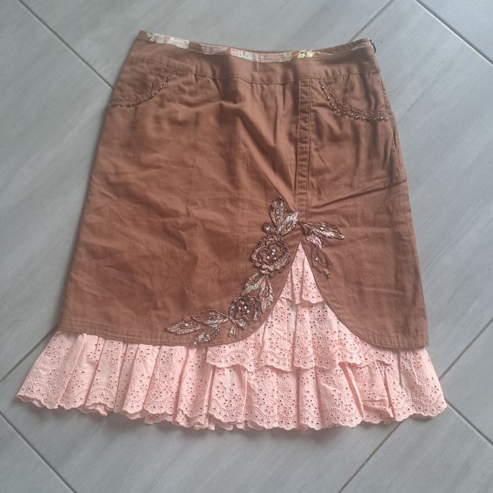 Jupe original longueur genou environ Fermeture éclair sur le côté gauche Effet dentelle épaisse dans le bas , ajouré Avec des poches ayant des décors de perles Ouverture fente à l'avant avec broderie et perles Couleur marron et rose Pas d'étiquette de taille ( mesure en photo) correspond environ à du 38 Marque Paul Brial