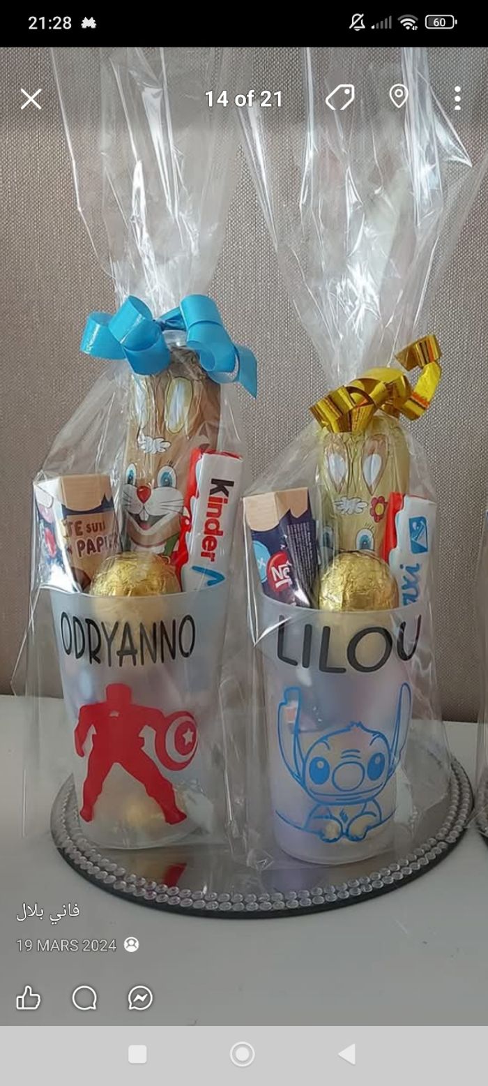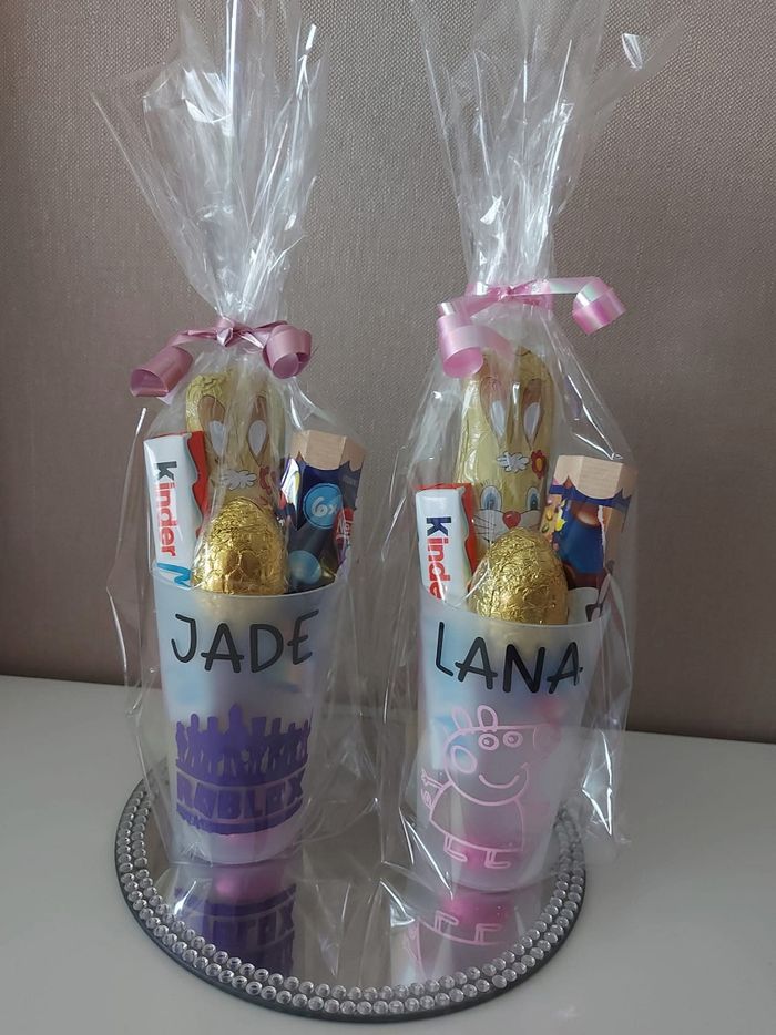 Bonjour, je réalise des gobelets personnalisés pour Pâques garni de chocolat. Je reste disponible en mp si besoin ☺️
