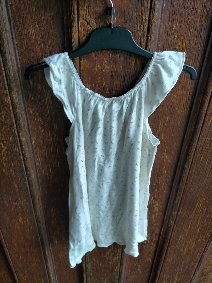 TBE très jolie nuisette à manches volant en jersey de coton blanc cassé imprimé de petites fleurs roses. Gamme boutique