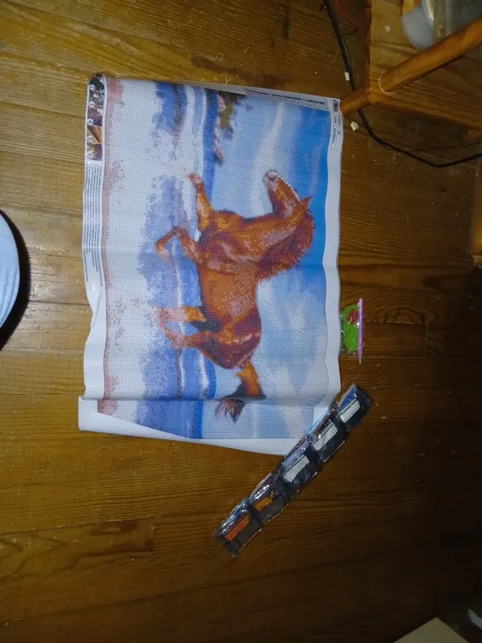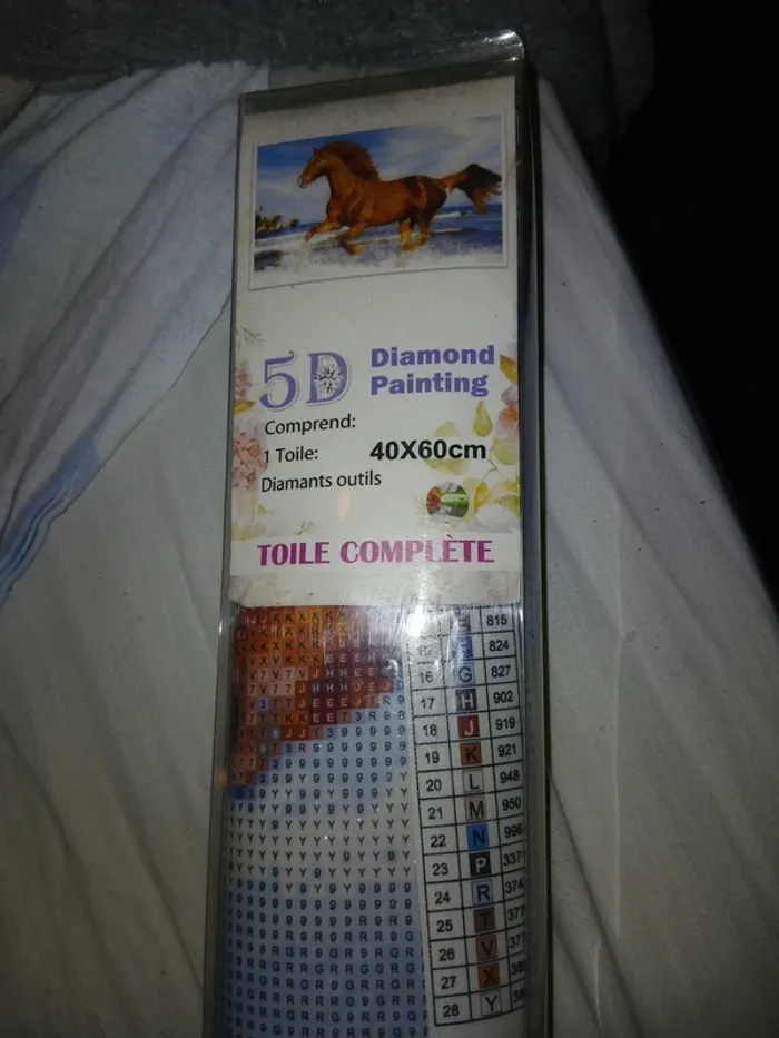 Je vends ce kit de diamond painting complet représentant un cheval au galop. - Type de produit : Kit de diamond painting - Dimensions : 40 x 60 cm - Accessoires inclus : Toile pré-imprimée, diamants, outils État neuf, le kit est encore scellé. N'hésitez pas à me contacter pour plus d'informations !