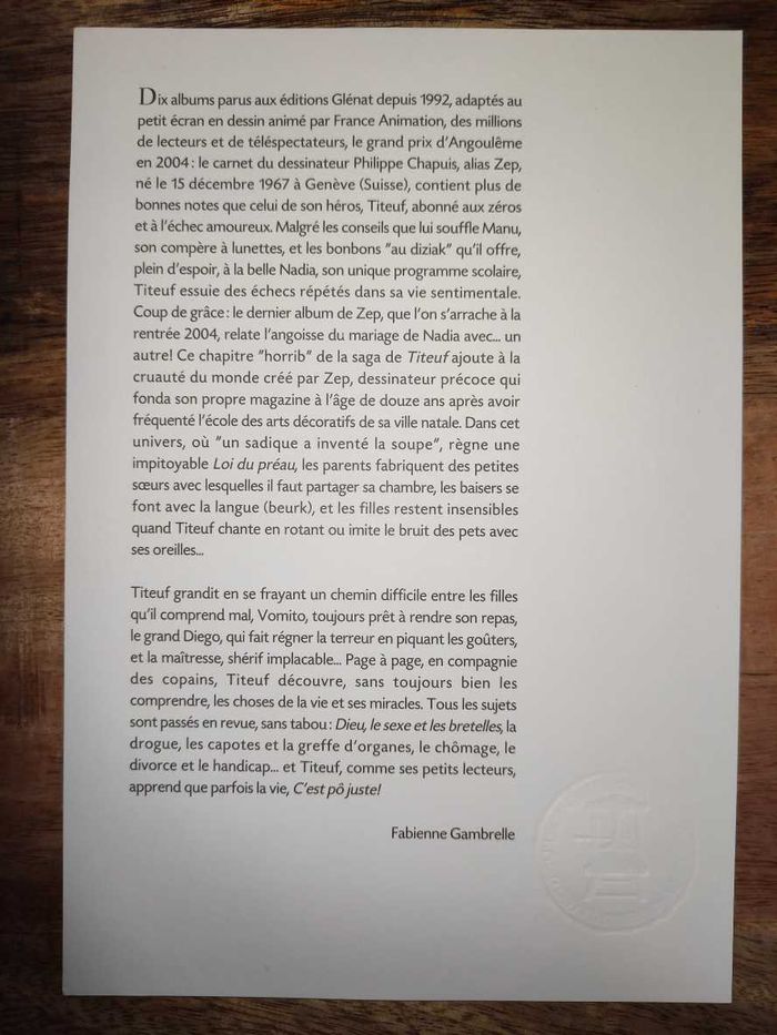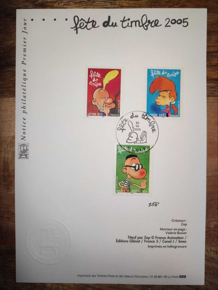 Notice Philatélique Premier Jour 💌 Fête du timbre 2005 Titeuf 💌 Créateur Zep 3 timbres Titeuf lettre 20g oblitérés 26.02.2005 PARIS Marque en relief Format demi A4 21x14,5 cm imprimé en héliogravure Excellent état (voir photos) .