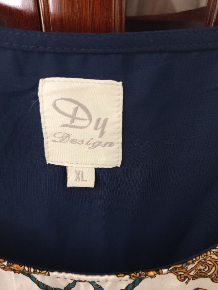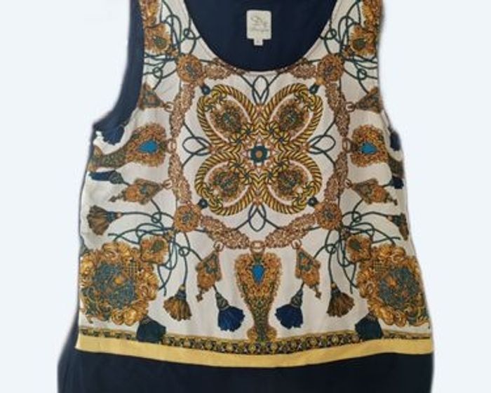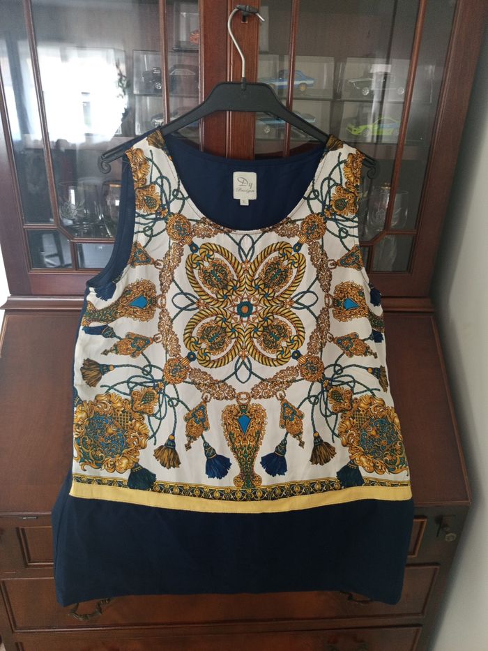 haut femme aux motifs baroques dorés et bleus, parfait pour apporter une touche d'élégance et d'originalité à votre garde-robe. - Type de produit : Haut - Univers : Femme - Taille : 42 - XL - Couleur : sur le devant Motifs baroques dorés, bleus et crème sur fond blanc - Caractéristiques : Col rond, sans manches, doublure intérieure bleu marine - Détails : Bande jaune en bas du haut face dos couleur bleu marine