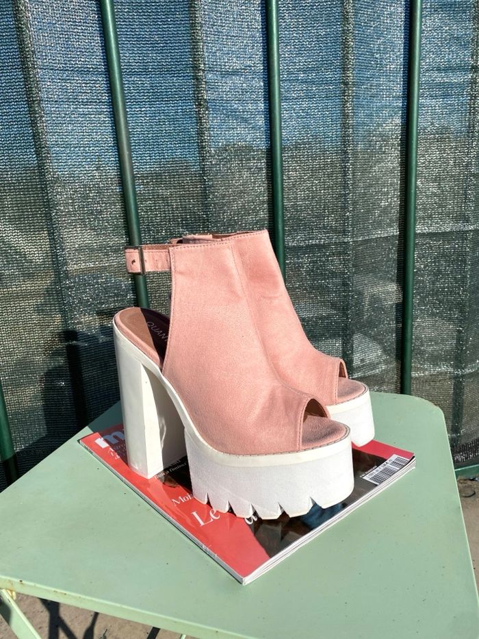 Magnifique paire de sandales Quanticlo à talons plateformes rose et blanche. Chaussures en daim rose. Super confortable. Pointure 37 Hauteur des talons 15cm Hauteur plateaux : 5cm Neuve.