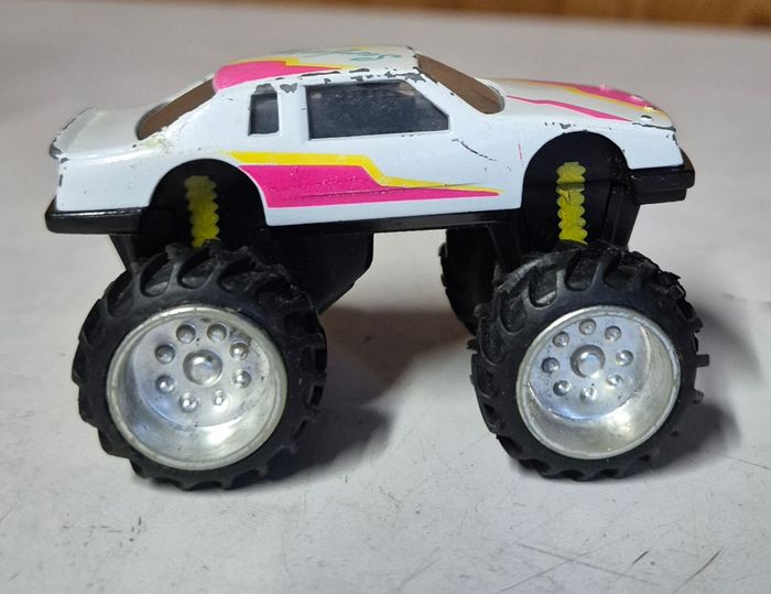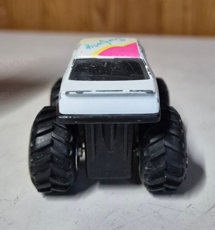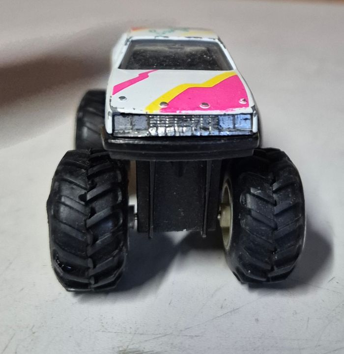 Monster Truck M.C Toys, échelle environ 1/36, modèle vintage avec carrosserie blanche et décorations colorées type “Crunch”. Gros pneus à crampons, suspension jaune et jantes chromées. Le dessous porte la mention M.C Toys. Le véhicule présente des traces d’usage (peinture usée, petites marques), mais reste solide et fonctionnel. Vendu tel que visible sur les photos. #mctoys #monstertruck #4x4barbie #voitureminiatureoccasion #diecast #miniature136 #toycar #collectionminiatures #vintagecar #crunchdesign #monstertrucktoy #voituredejouet