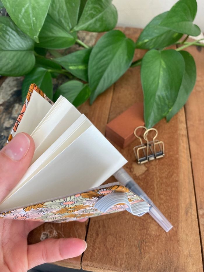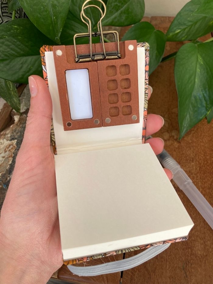 Lot kit aquarelle nomade Format miniature idéal en plein air, en balade créative ou voyage - Carnet bloc 8x8 cm, 40 feuilles détachables, couverture rigide en tissu - Palette en bois à remplir avec des tubes d’aquarelle, 6x6 cm, aimanté pour un pliable de poche, pince incluse - Pinceau à réservoir Neuf