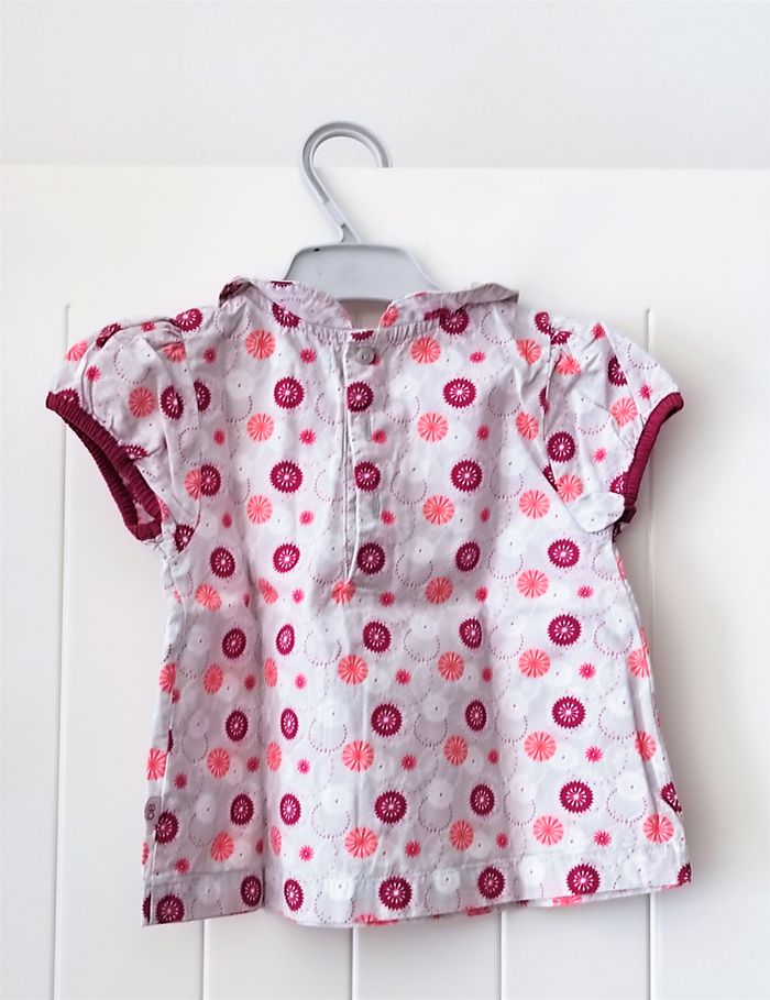 "Belle petite tunique à manches courtes pour bébé fille – taille 12 mois. Col rond Fermeture par 3 boutons au dos Motifs ronds Coloris : bordeaux, gris, rose, blanc Excellent état (très peu portée, aucun défaut) 👶 Idéale pour un look confortable et mignon au quotidien. État : Excellent"
