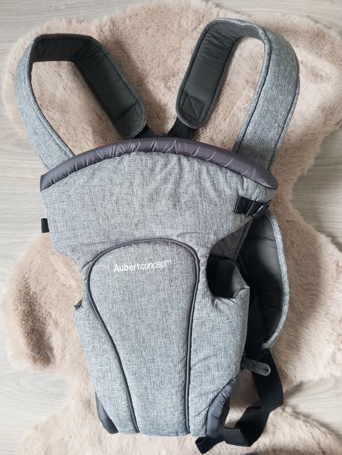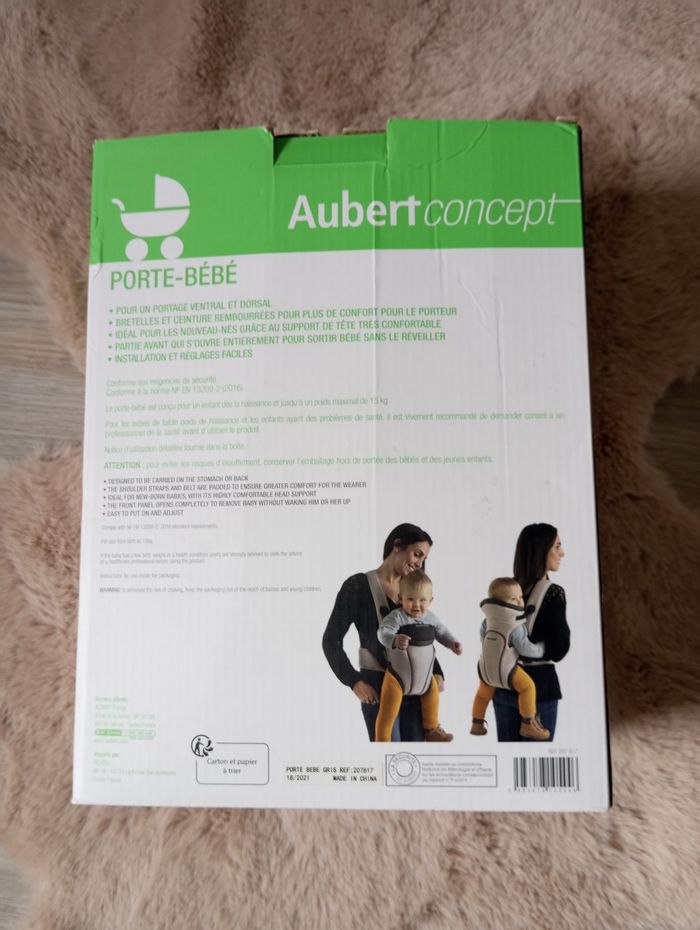 Porte bébé marque Aubert Concept. Très peu utilisé. Le porte-bébé Aubert Concept permet un portage ventral ou dorsal agréable pour les parents, grâce à ses bretelles et sa ceinture de soutien rembourrées, entièrement réglable et adaptées à toutes les morphologies. Grâce à l’ouverture intégrale de la partie avant et à tous les réglages simplifiés, vous pourrez installer Bébé rapidement et en toute sécurité. De son côté, Bébé est maintenu confortablement contre vous dans la poche centrale rembourrée en coton doux. Pour un confort encore plus optimal, vous avez aussi la possibilité d’ajuster le passage de ses petites jambes. Un véritable nid douillet ! Si vous optez pour un portage ventral, idéal pour les nouveau-nés, Bébé bénéficiera d’un support de tête qui maintient sa nuque, grâce à une hauteur adaptée, ajustable très facilement via des boucles. Dès qu’il tient sa tête tout seul, vous pourrez l’installer face route et abaisser le support de tête. Pour un portage dorsal, particulièrement pratique pour les plus grands, il sera placé dans le dos du porteur une position adaptée à sa morphologie. En avant pour des balades chics et décontractées avec Bébé ! Caractéristiques techniques : Utilisation de la naissance et jusqu'à 15kg (environ 3 ans). Portage dorsal et ventral (position face parent ou face monde)