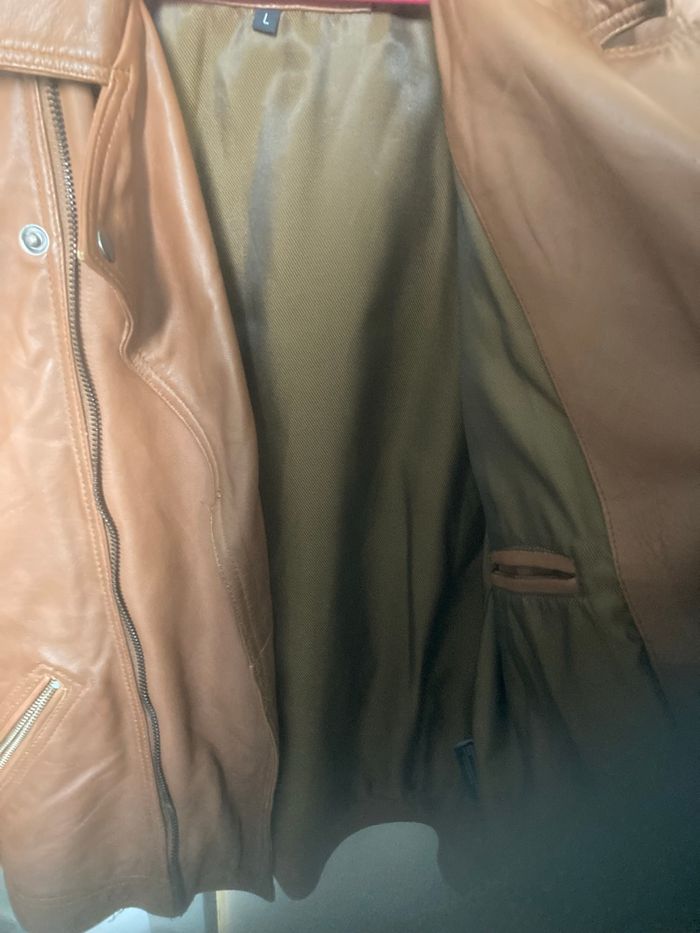 Magnifique blouson en cuir homme jamais porté, couleur cognac, taille L ,en cuir de mouton. Pas de taches en parfait état.