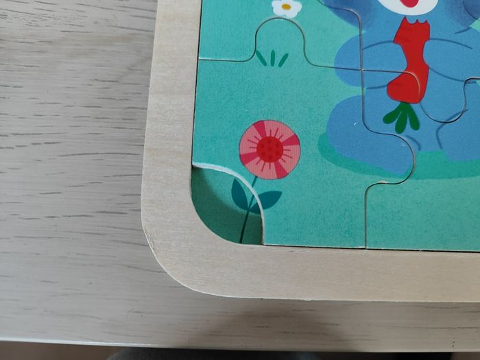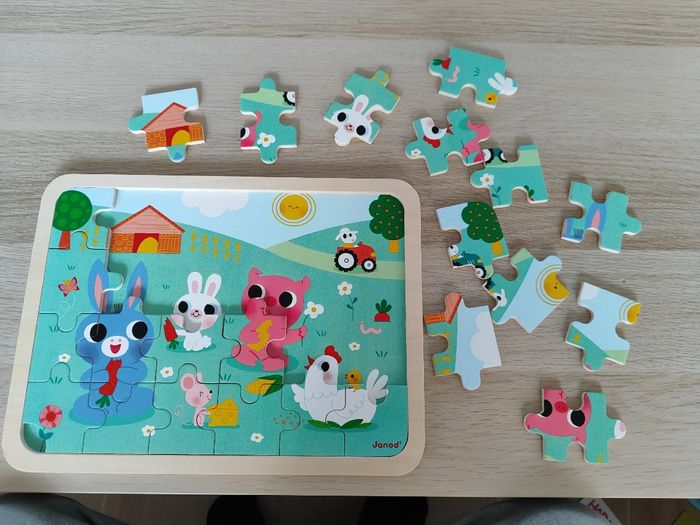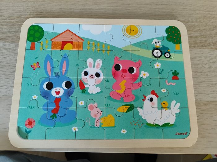 Puzzle Janod 24 pièces A la Ferme Neuf, déballé, vente pour cause de cadeau doublon Pièces et cadre en bois; avec photo en fond pour aide à l'assemblage Angle bas gauche avec facilité de deboitage Il y a qques différences entre le fond et le puzzle, c'est normal, il y a un jeu des 5 différences intégrés (exemples : mais a gauche de la poule avec et sans feuille, couleur de la souris, couleur du tracteur en haut a droite du mouton ...)