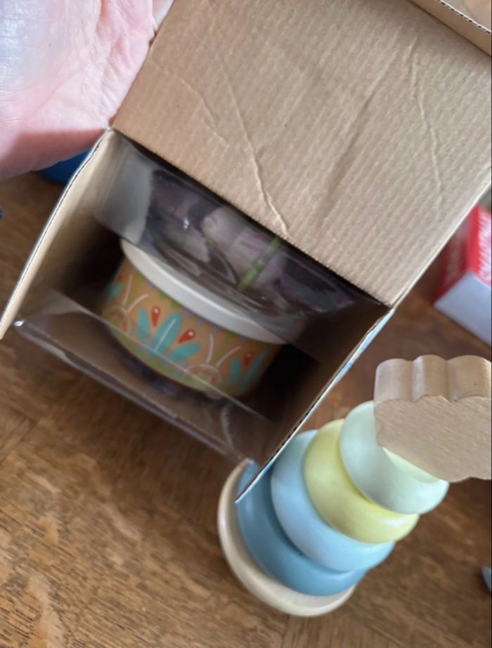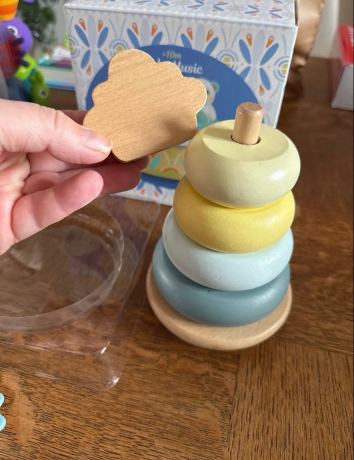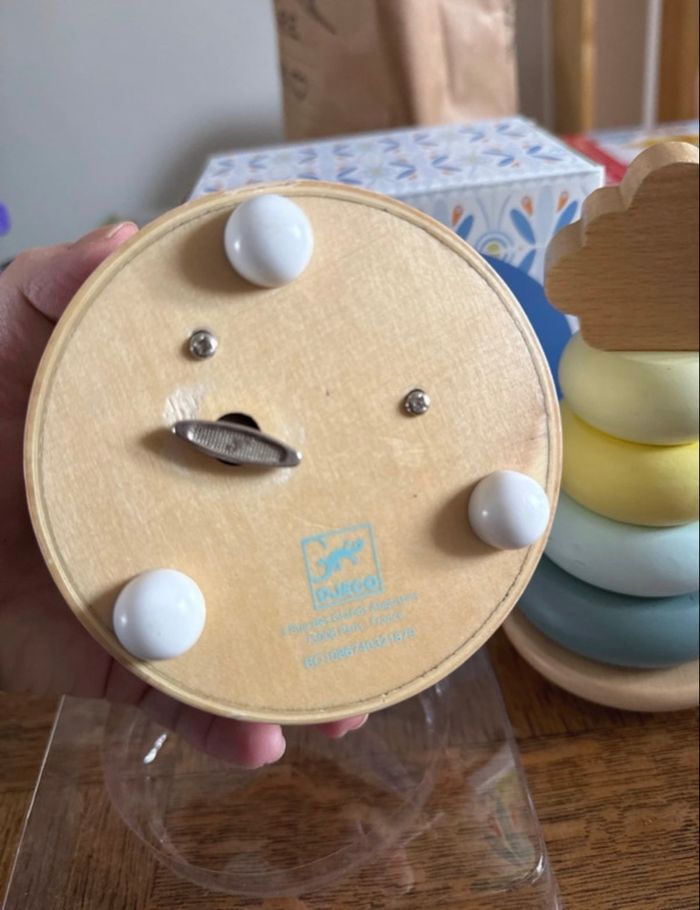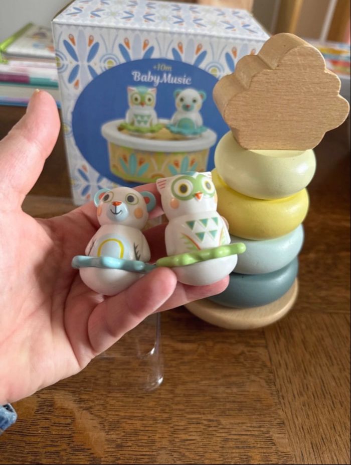 Une boîte à musique en bois naturel et aux couleurs pastel. On tourne la clé et tout s’anime ! Bébé se laisse bercer par la douce mélodie et observe les deux hochets ours et hibou danser en musique. Djeco Plus jeu à empiler Monoprix À partir de 10 mois
