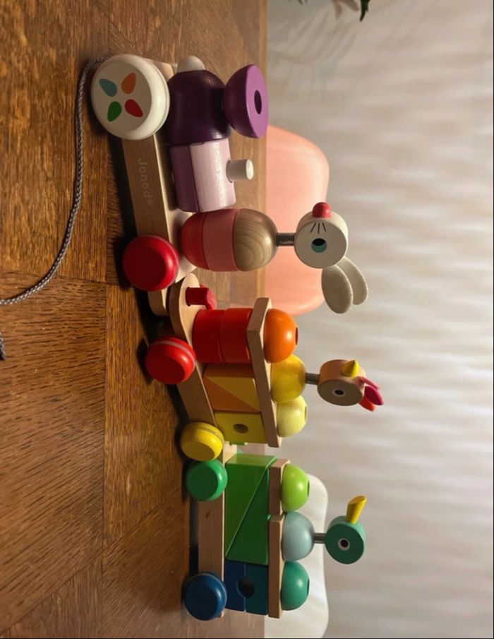 ◦ Jouet d'éveil 2 en 1 ◦ Plein de couleurs ◦ Pour développer la motricité de bébé Bienvenue à bord du train Géant Zigolos ! Prenez place, nous allons bientôt partir ! Ce jouet 2 en 1 en bois est un jouet premier âge à promener pour aider les tout-petits à développer leur motricité mais aussi un jeu à empiler. Grâce aux nombreux blocs à placer sur les wagons, les bébés à partir de 1 an vont apprendre les formes et les couleurs en s'amusant. Le Train Géant Zigolos est un jouet complet que votre enfant appréciera tout particulièrement pour ses jolies couleurs et les animaux rigolos du wagon ! Et pour cause, leur tête montée sur ressort se dandine dès que le véhicule se met en marche ! Le canard, la poulette et le lapin sont prêts à découvrir l'univers de bébé ! On s'amuse recréer à l'identique ou à associer les cubes en bois selon ses envies. Pour plus de confort, les roues sont silencieuses grâce au caoutchouc antidérapant. Longueur de la ficelle : 50 cm. Peinture à l'eau. Vendu 39,99€ sur le site Janod