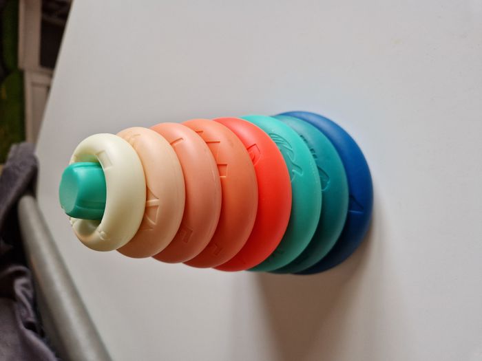 Vends une pyramide de 8 anneaux arc en ciel de chez Ludi Tres bon etat . Je vends dautres jouets et autres nhesitez pas a me demander si besoin