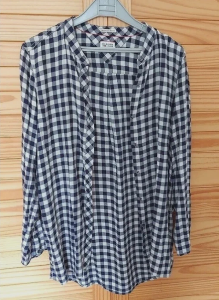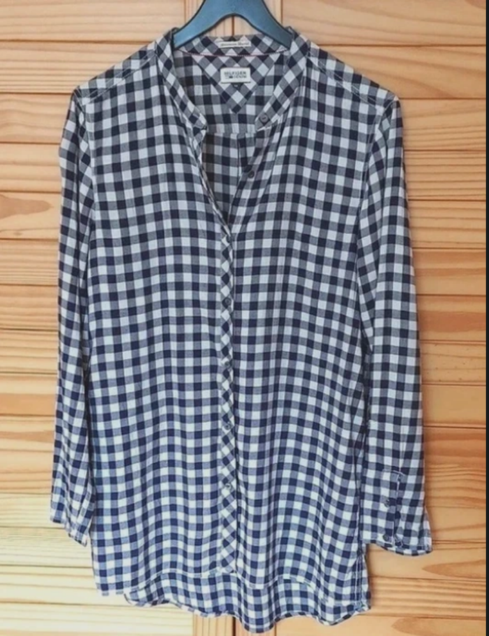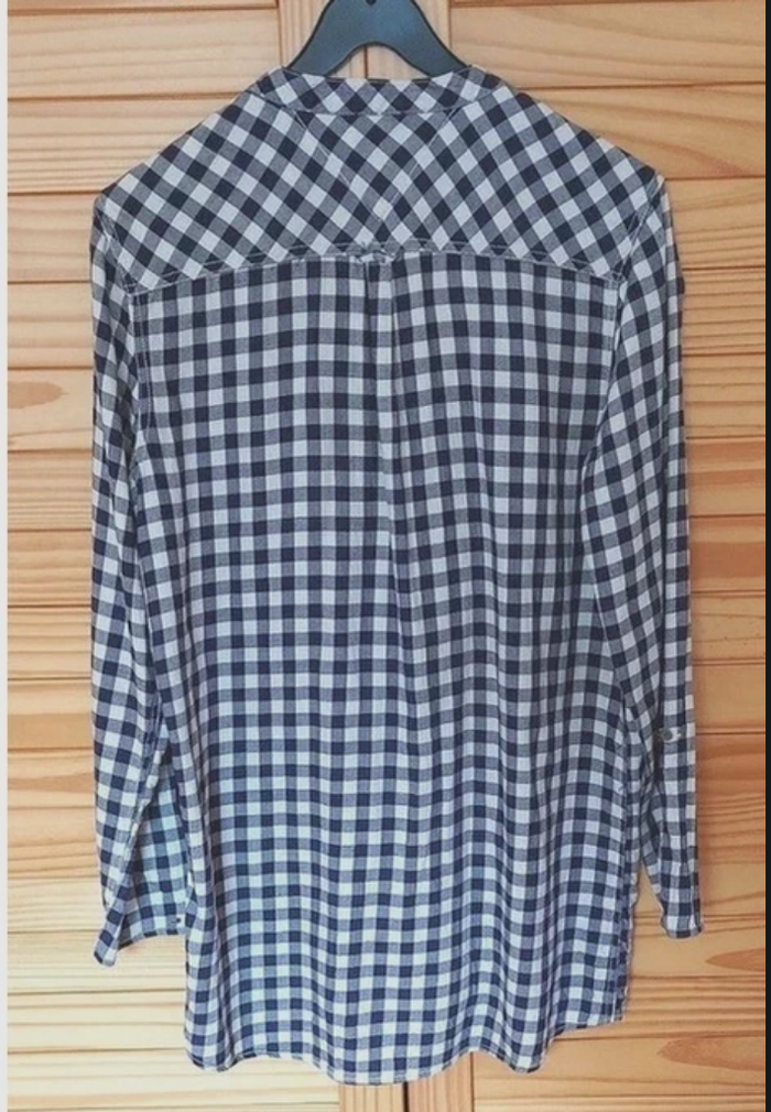 Longue chemise oversize ou surchemise vichy marine et blanc , manches retroussables, pouvant se porter en toute saison. Longueur dos environ 80 cm. Convient à tailles 38 et 40.