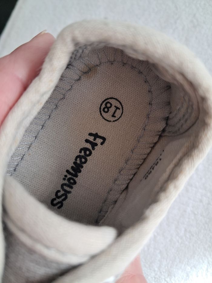 Chaussure tennis grise Très bonne état général, seul une mini tâche sur dessus du pied D ainsi que sur la semelle intérieure et mini point sur pied G voir photo. Pointure 18 Marque Freemouss