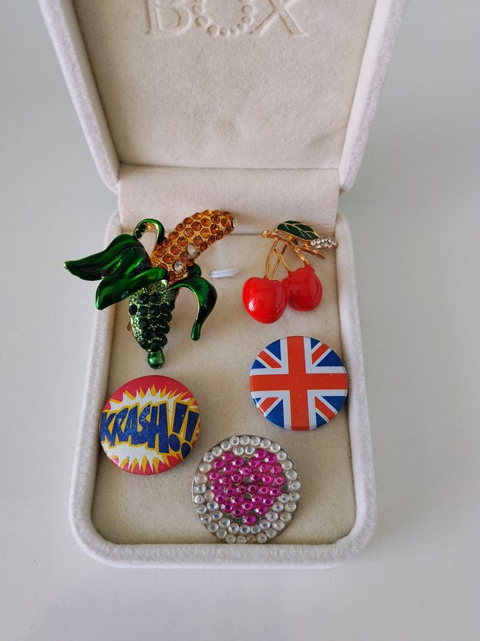 Vends un lot de broches fruits doré, cerise strass , anglaise, très bon état a bon état,je vends aussi d autres articles pensez à faire un lot pour activer la réduction et économiser sur les fdp