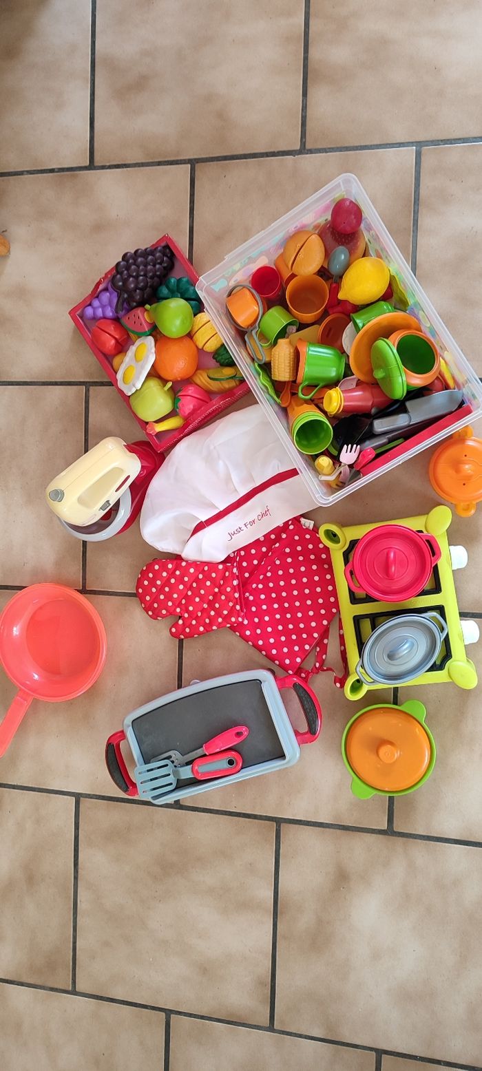 Éléments en plastique Tablier, manique et bonnet de cuisinier Contient fruits, légumes, assiettes, casseroles, couverts, couteaux à découper, table de cuisson, etc
