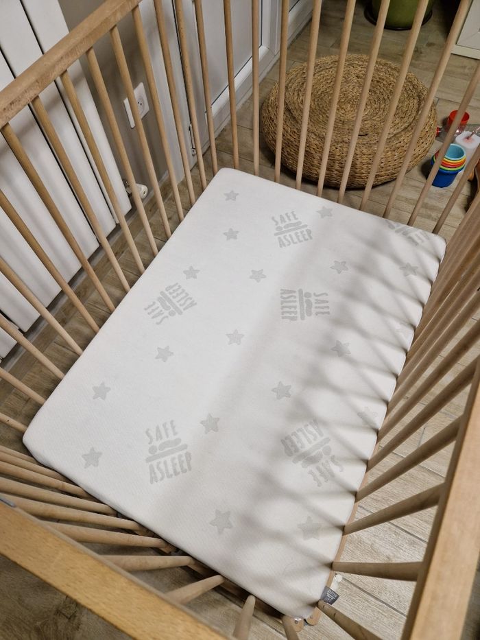 Parc bébé en bois naturel À venir chercher sur place. (95 Val d'Oise) Pliable, sur roulettes (blocables), 3 hauteurs Idéal petits espaces : Profondeur 72 x103 longueur x 73 hauteur Vendu avec son matelas déhoussable + 1 Alèse Prix initial du parc 120 €. Prix initial du matelas 45 €. Acheté chez Maison du Monde.