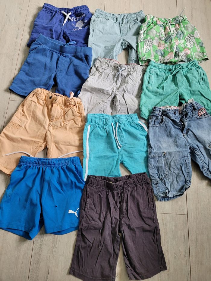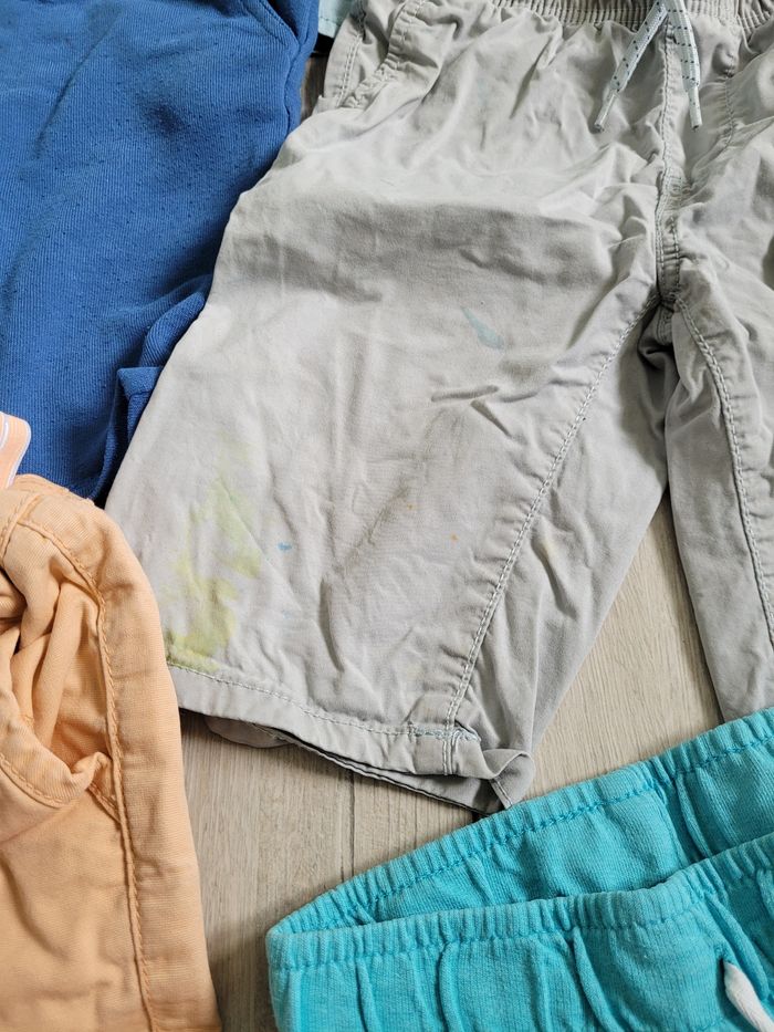 Il comprend : - 19 Tee-shirts idéal pour enfant qui aime jouer dehors ils sont tâcher et décolorés - 1 chemise très bon état juste un bouton cassé sur une manche - 11 shorts idéal pour enfant qui aime jouer dehors ils sont tâcher et décolorés pour certains et un peu troué