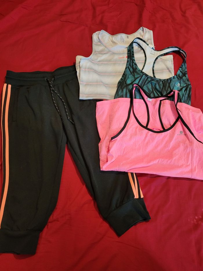 Lot de vêtements de sport comprenant 1 pantacourt Adidas Taille S 2 maillots Domyos XS 1 maillot Artengo S Tout en très bon état