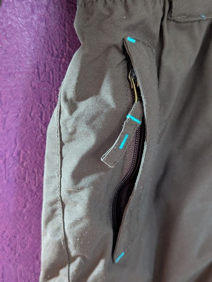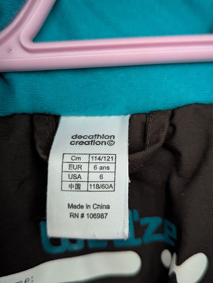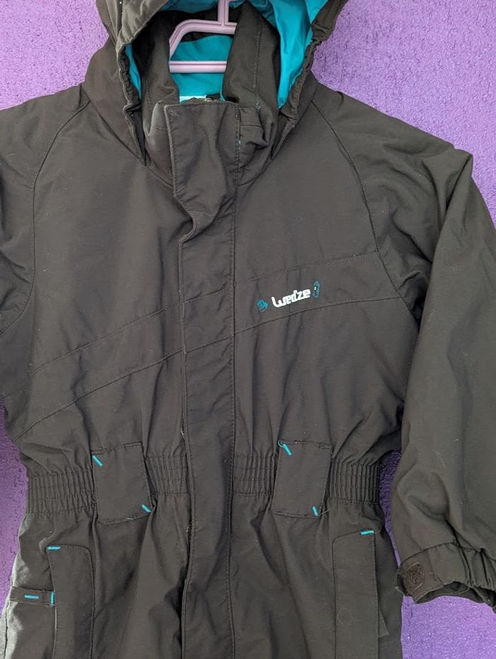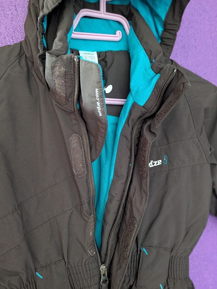 Combinaison de ski marron avec capuche - Taille 6 ans Fermeture zippée et à scratchs - Broderies au dos turquoises + 2 poches latérales zippées à rabat Manches longues resserrées à la base - Taille, poignets et bas élastiqués Capuche fixe avec scratch arrière pour maintenir le masque de ski Confortable, chaude (isolation ouatée), imperméable et entièrement doublée - Belles finitions d'ourlets piqués Marque Décathlon Wed'ze - Portée seulement pendant ces vacances de février d'ou son très bon état