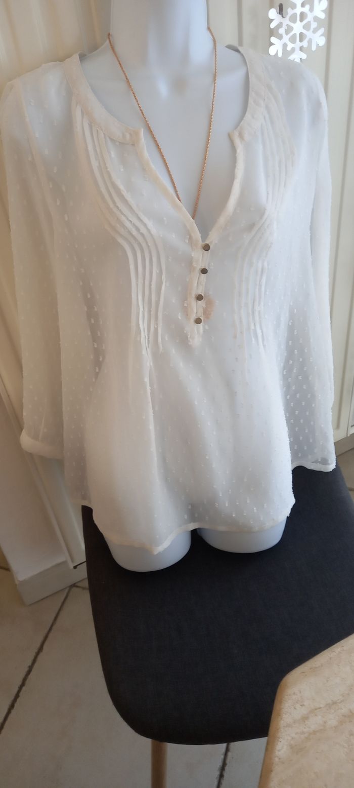 Blouse blanche plumetis Kiabi achetée trop grand état neuf aisselles 56cm va au 40.42