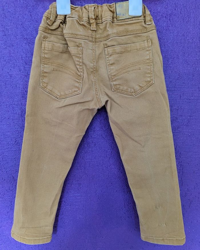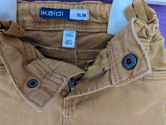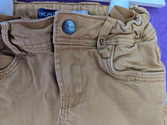 Pantalon Okaïdi couleur moutarde - Coupe slim - Taille 3 ans Fermeture zipée terminée par une pression + Ceinture modulable avec passants + 5 poches (3 avant, 2 arrière) (un T. Shirt "South Island" de marque Orchestra Taille 3ans sera offert avec ce pantalon)