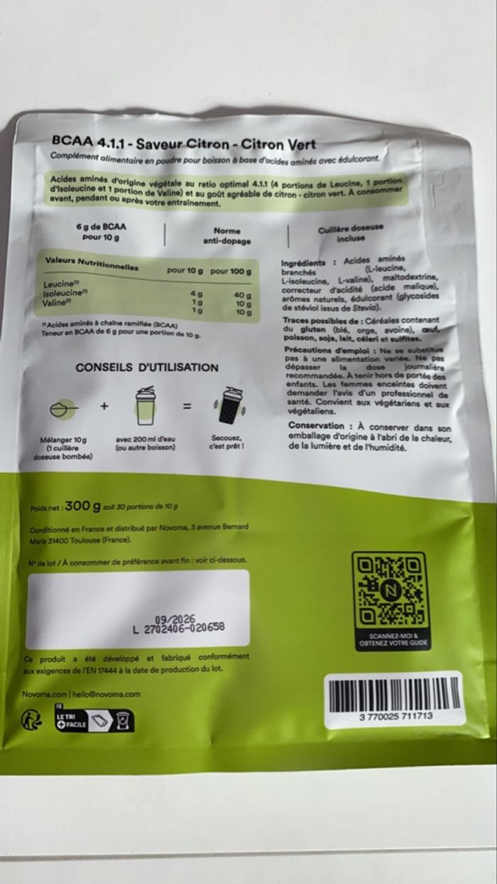 Vends acides aminés Marque Novoma Saveur citron et citron vert Idéal pour les sportifs Neuf Prix : 12 euros