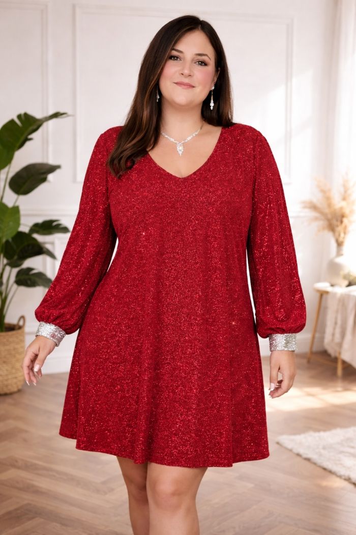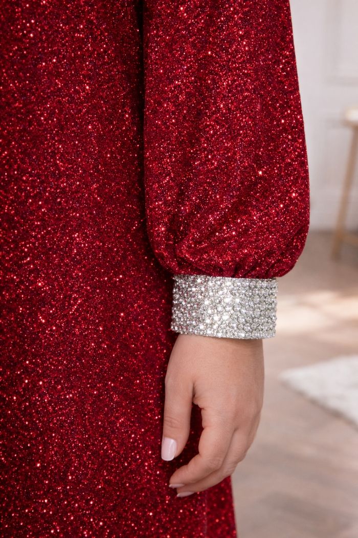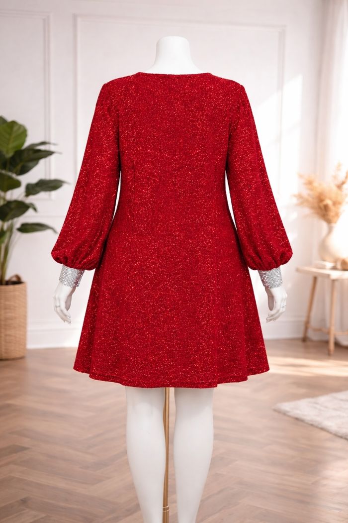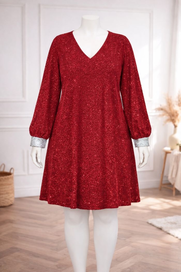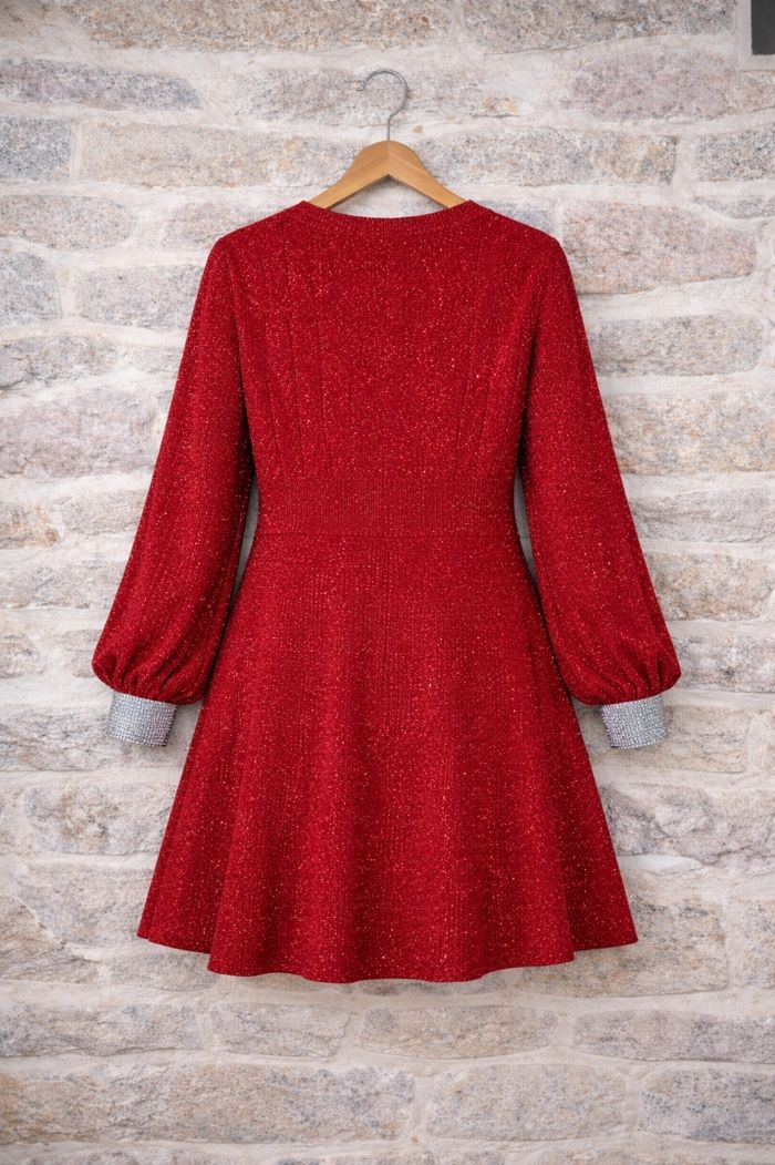Robe de soirée scintillante rouge passion pailleté argenté Femme taille 54 marque Asos ✴️ Décolleté en V ✴️ Manches longues ✴️ Poignets argenté pailleté ✴️ Couleur => Rouge passion avec des micros paillettes ✴️ Composition => 76 % polyamide 17 % elastanne 7 % fibres métalisées ✴️ Longueur => 101,5 centimètres ✴️ Mesure épaules à épaules => 42,5 centimètres ✴️ Tour de poitrine => 133 centimètres