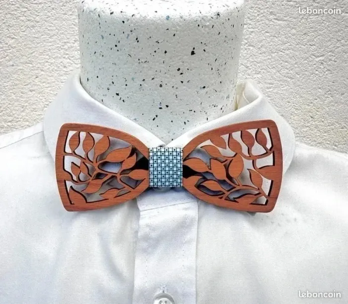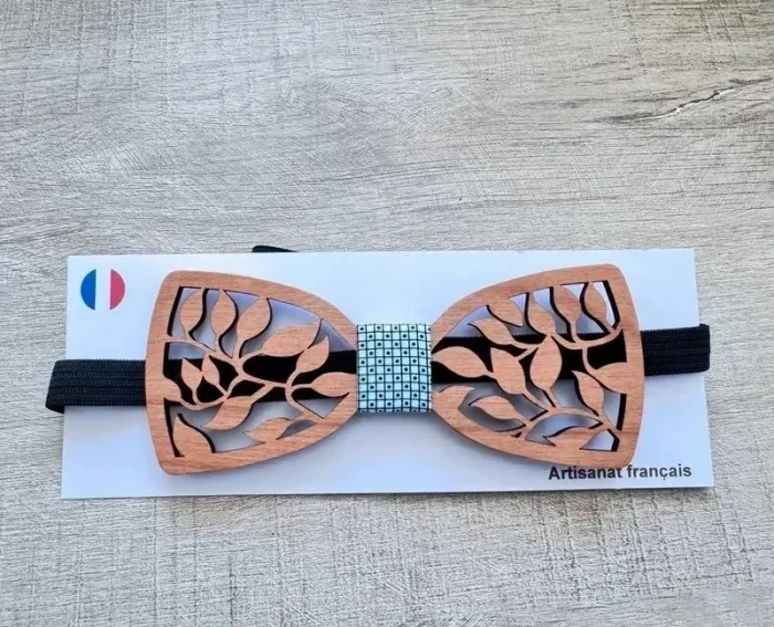 Beau nœud papillon artisanal en bois de merisier thème nature et feuillage.
