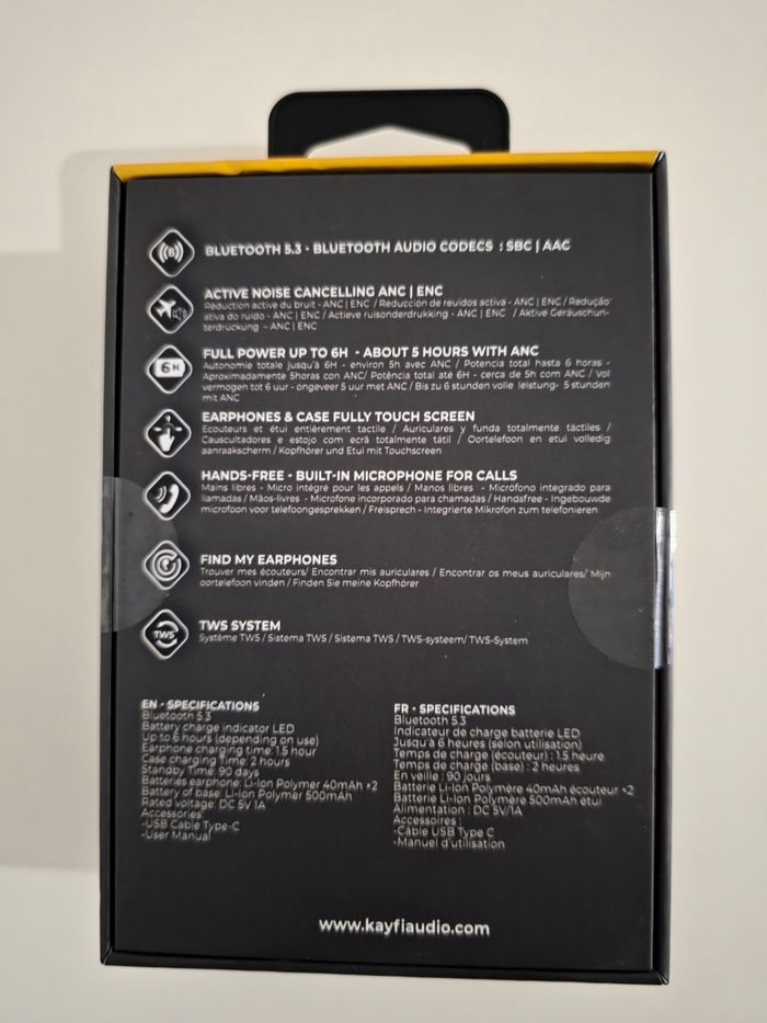 Écouteurs Bluetooth avec écran de contrôle tactile- KAYFI NEUF.( Jamais servi) Écouteurs anti bruit (ANC) avec écran de charge. - Bluetooth 5.3 - Bluetooth Audio code - Réduction du bruit active (ANC) - Autonomie totale jusqu'à 6h - écouteurs et étui totalement tactile. - Mains libres - Micro intégre pour les appels. ⚠️ ENVOI UNIQUEMENT Envoi rapide Colissimo ou tout points relais.