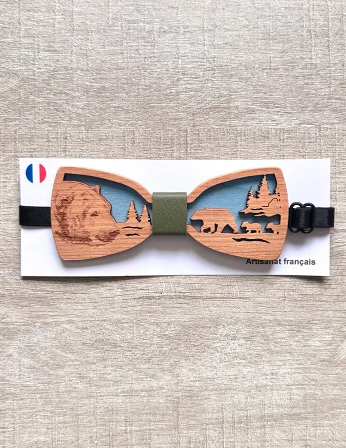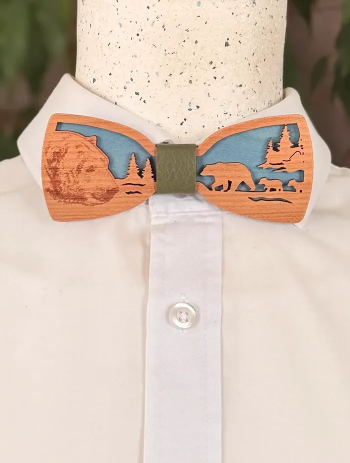 Nœud papillon artisanal en bois – Scène d’ours - photo numéro 1