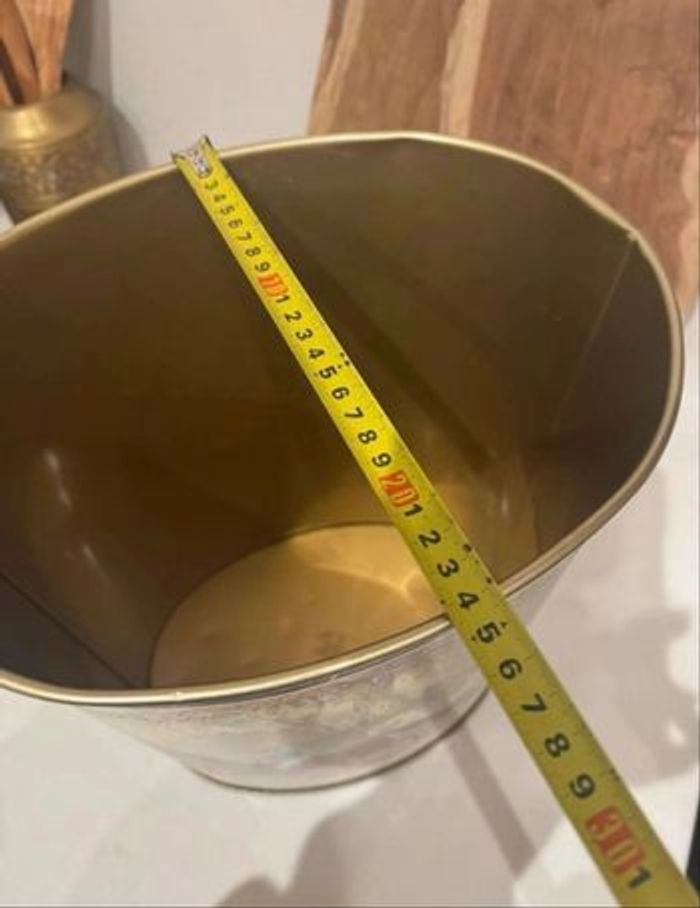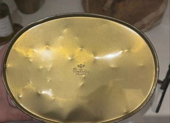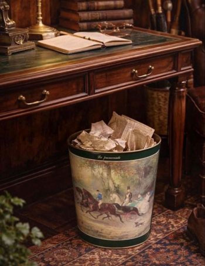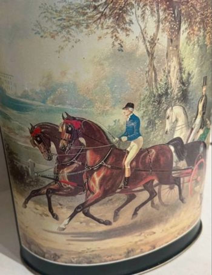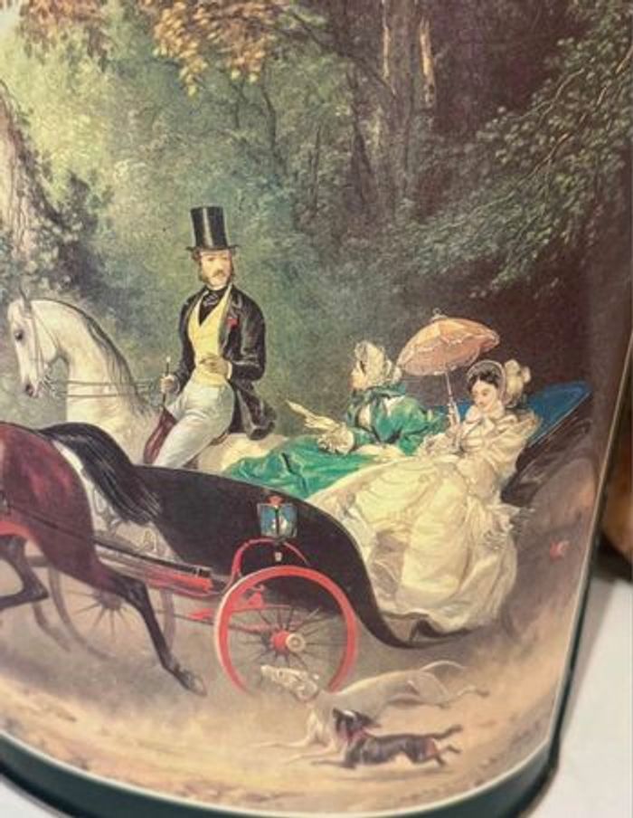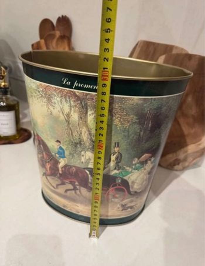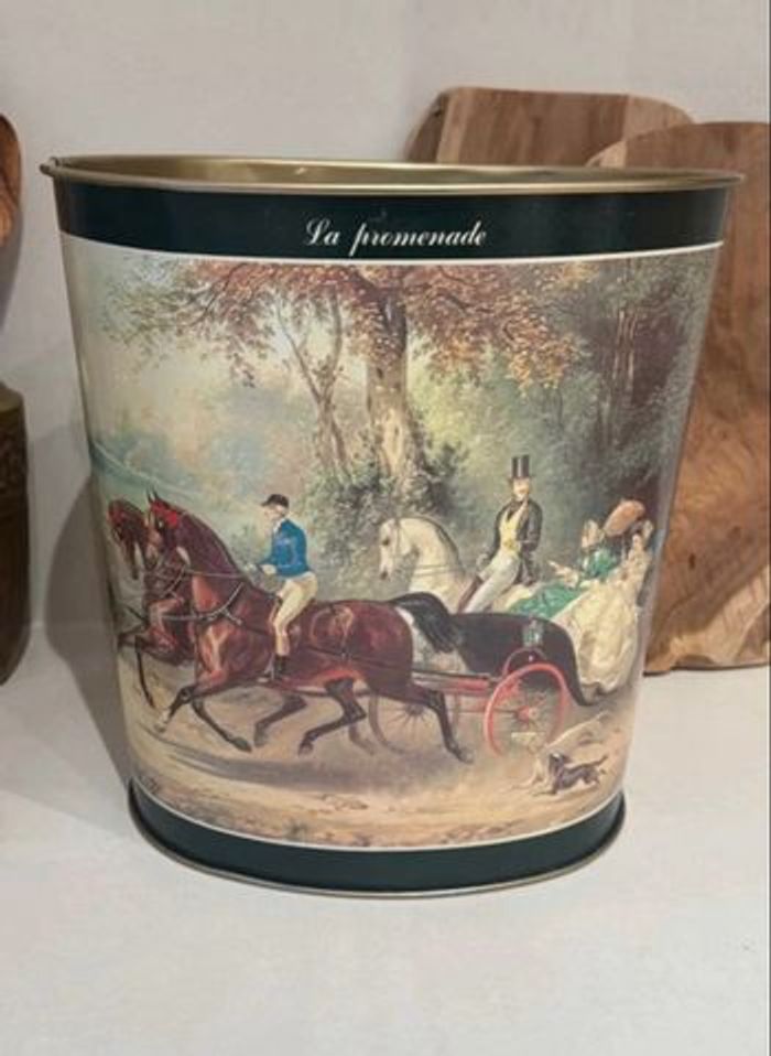 Magnifique corbeille à papiers en métal émaillé grand format, estampillée Massilly France sous le dessous. Pouvant être également utilisée comme porte-parapluies ou bien comme cache pots avec une belle plante. Décor équestre romantique intitulé « La promenade », représentant une élégante scène de calèche et de cavaliers du XIXᵉ siècle. Intérieur doré. Objet des années 1970-1980, à la fois pratique et très décoratif dans une entrée ou un salon au style classique, vintage, anglais ou français d’époque. Dimensions environ : • Hauteur : env. 30 cm • Longueur : env. 29 cm • Largeur : env. 24 cm État : En très bel état général, pas de traces de rouille. Les dessins sont superbes pour leur âge. L’intérieur doré est propre mais la tôle présente quelques marques dû aux pointes des parapluies. 📌 1ère photo non contractuelle, simplement pour illustrer l’article.