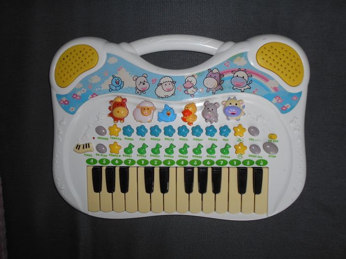 Vends ce piano musical et sonore: avec sons d'animaux et différentes musiques (disco, samba, pop...),en bon état, fonctionne parfaitement.