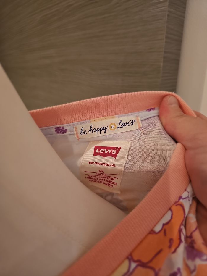 Très jolie robe Levi’s à imprimé fleuri, aux tons pastel (orange, violet, jaune, écru 🌸). Coupe féminine avec taille marquée, tissu fluide et agréable à porter, idéale pour le printemps et l’été ☀️ Petit détail sympa : logo Levi’s brodé sur la poitrine + finitions de qualité. 🔹 Détails Type : robe Marque : Levi’s Motif : fleurs Couleurs : pastel (orange, violet, jaune) Manches : courtes Col : rond Style : casual / été / bohème 📏 Taille 14 ans – 158 cm (étiquette) ➡️ Peut aussi convenir à un XS femme selon morphologie 🧼 État ✅ Très bon état ✅ Aucune tache, aucun trou ✅ Bon état général, sans défaut