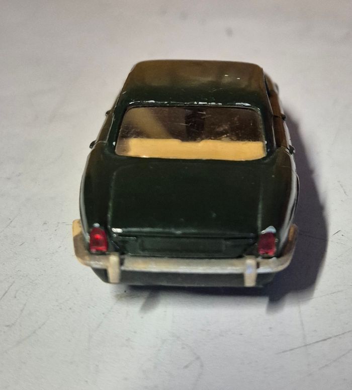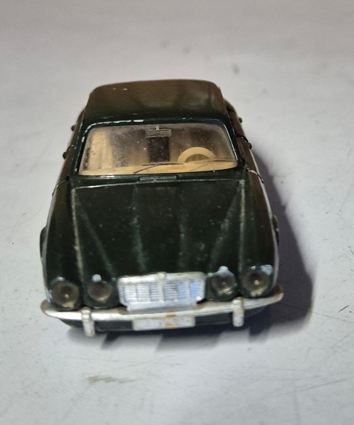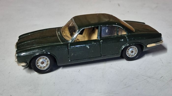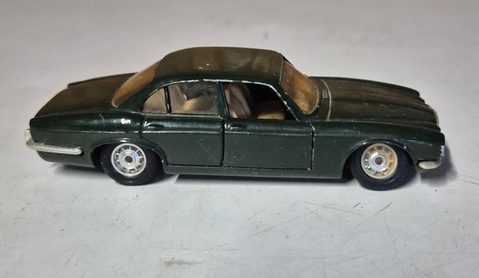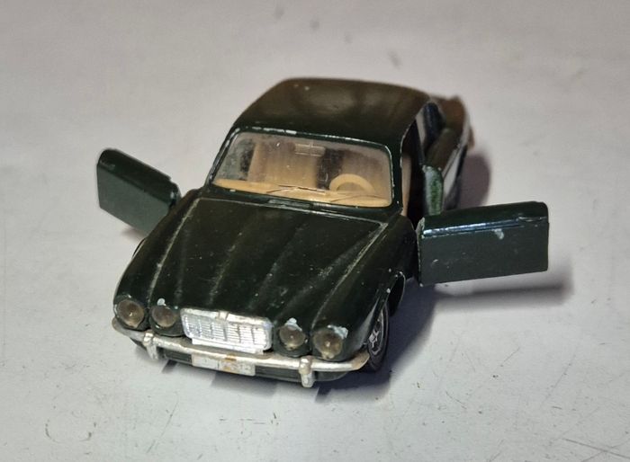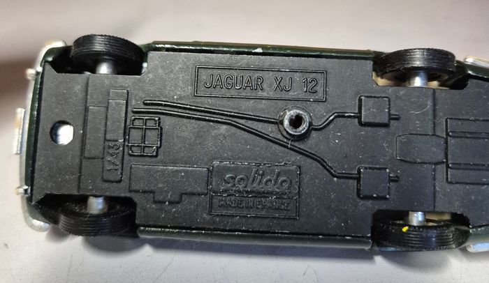 Jaguar XJ12 de la marque Solido, échelle 1/43, fabriquée en France. Carrosserie vert foncé, intérieur beige, jantes chromées et portières avant ouvrantes. Le dessous porte les mentions Solido – Jaguar XJ12 – Made in France – Y43. Modèle en état joué : peinture marquée, petites rayures et traces d’usage. Vendu tel que visible sur les photos. #solido #jaguarxj12 #miniature143 #voiturevintage #diecast #madeinfrance #collectionminiatures #modelcar #jaguar #jaguarsolido #voituresolido