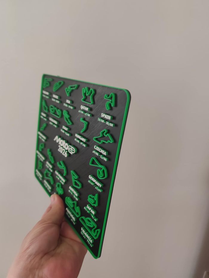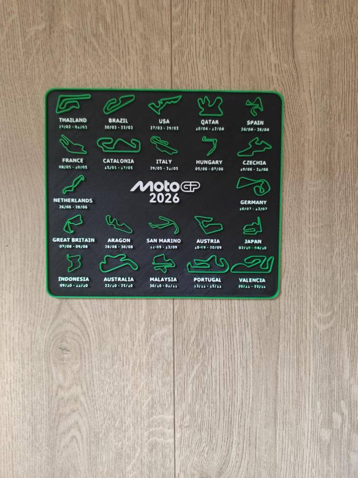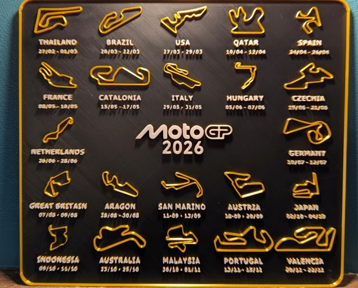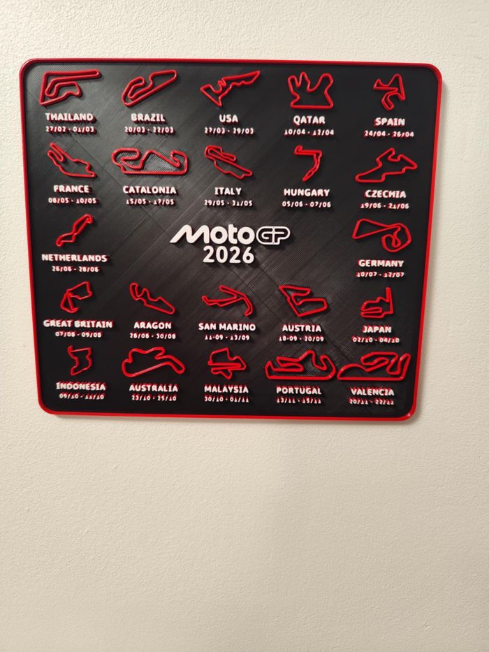 Décoration murale MotoGP 2026 Calendrier circuits Magnifique décoration murale noir et rouge bleu ou doré représentant le calendrier officiel MotoGP 2026 avec tous les circuits du championnat 🏁. Un objet unique et parfait pour les passionnés de moto et de vitesse 🔥. 📏 Dimensions : Largeur 21,4 cm Hauteur 18,8 cm 👉 Idéal comme cadeau ou déco pour une chambre, un salon ou un garage de fan MotoGP. #motogp #motogp2026 #motogpfan #motogpaddict #motogplover #motogpracing #motogpdecor #motogpfr #motogpworld #motogppassion #motorsport #racinglife #motorcycle #motoaddict #motolife #racingfan #decomurale #sportmecanique #motorsportlife #garageart #motocyclepassion #motogpmania #motorsportdecor #motogpmerch #moto Impression 3D 129D